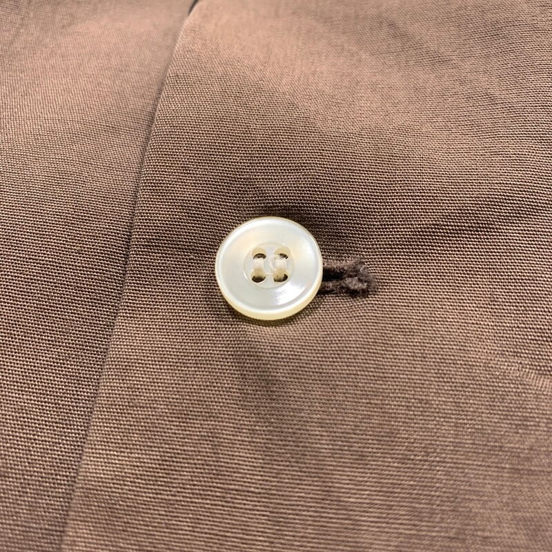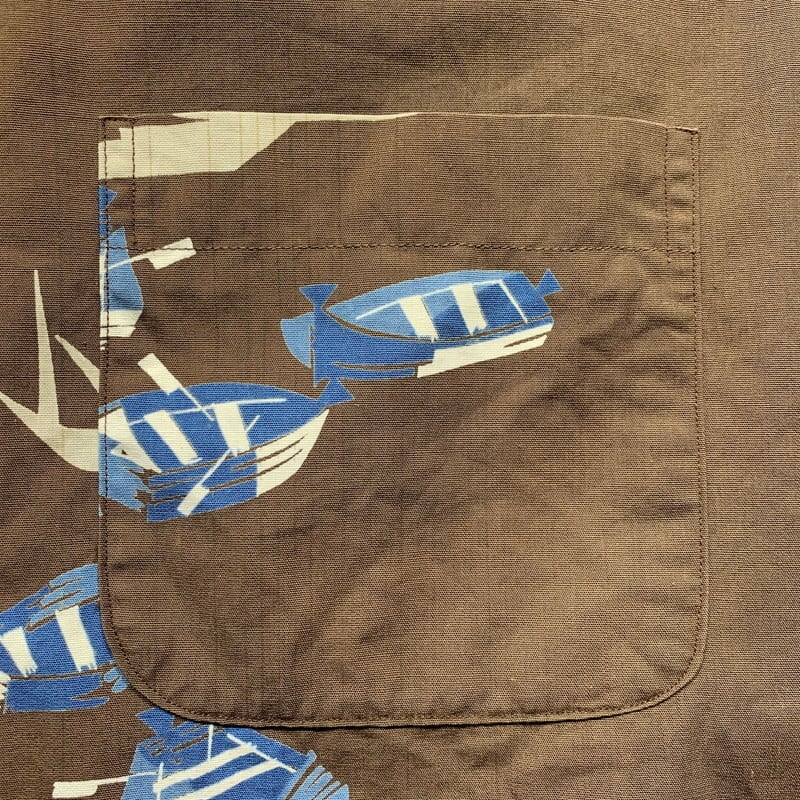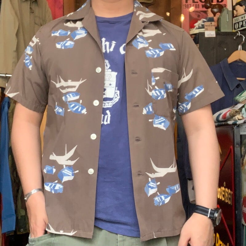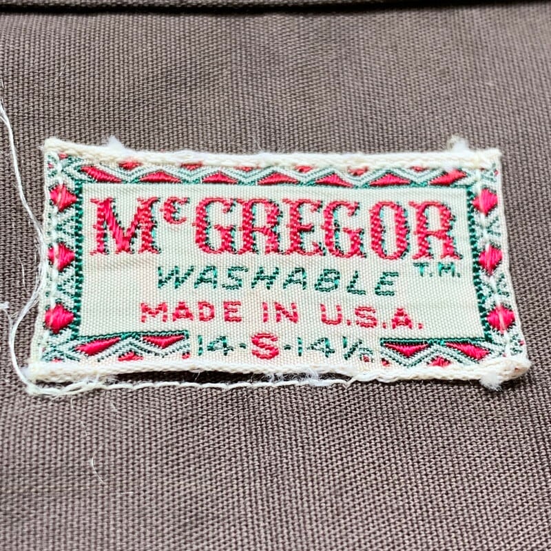 50年代頃のMcGREGORレーヨンシャツです。40年代の筆記体タグから移行した頃のアイテムです。張りのあるコットンが使用されており、手漕ぎボート柄が描かれてた1着です。写真ではわかりづらいですが、全体にランダムなストライプ柄もプリントされています。襟やボディに小さなシミはございますが、ダメージ等無くコンディションは良好です。サイズ表記はSで、170cm70kgのスタッフが着用すると、肩と脇がやや窮屈です。フロントを開ければ着れなくないですが、もう少し細身な方だと丁度良い塩梅で着ていただけると思います。古い年代のシャツで以外と見つかりにくいブラウンベースの柄物ですので、お探しだった方は是非いかがでしょうか。