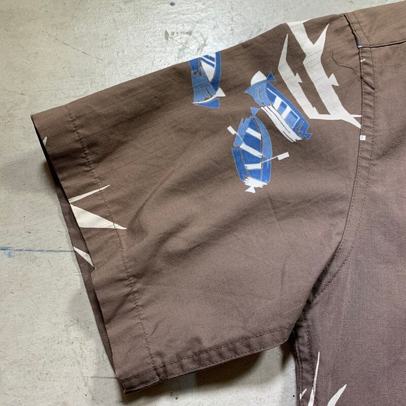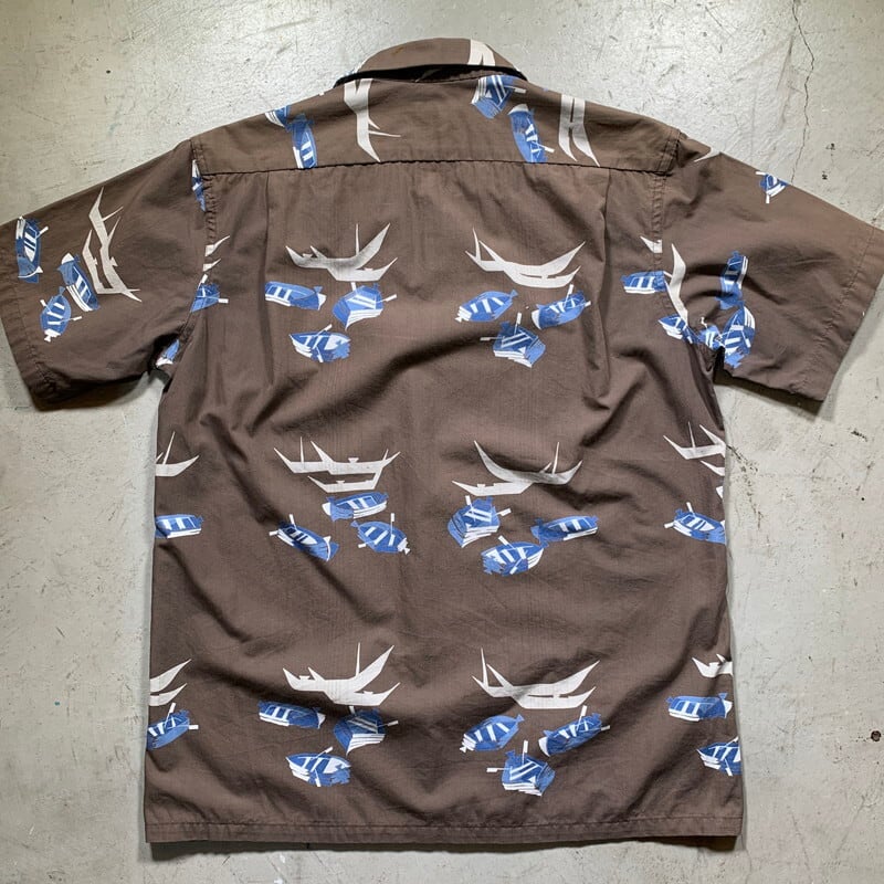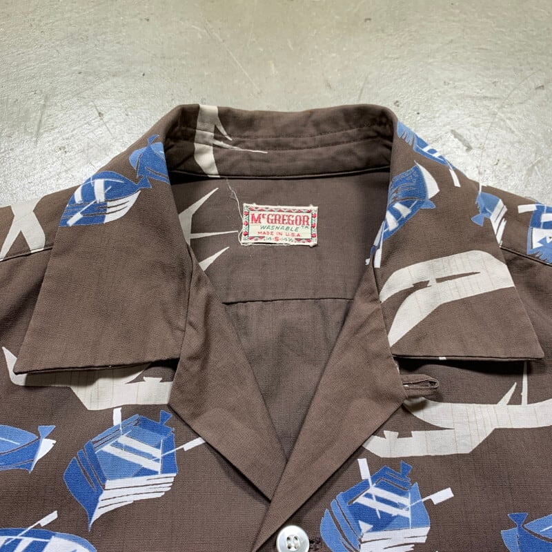 50's McGREGOR マクレガー コットンシャツ 手漕ぎボート柄 小舟柄 ブラウン オープンカラー 美品 Sサイズ USA製 希少 ヴィンテージ BA-1479 RM1848H