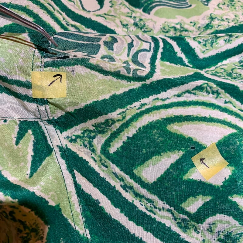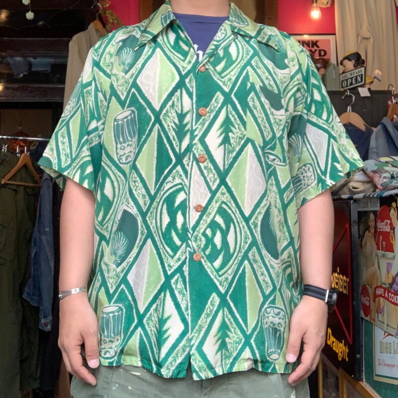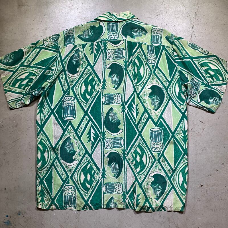 40's~ KAMEHAMEHA カメハメハ シルクアロハシャツ ジオメトリック柄 マヒオレ パフフラ グリーン バンブーボタン 大き目 XL相当 希少 ヴィンテージ BA-1482 RM1851H