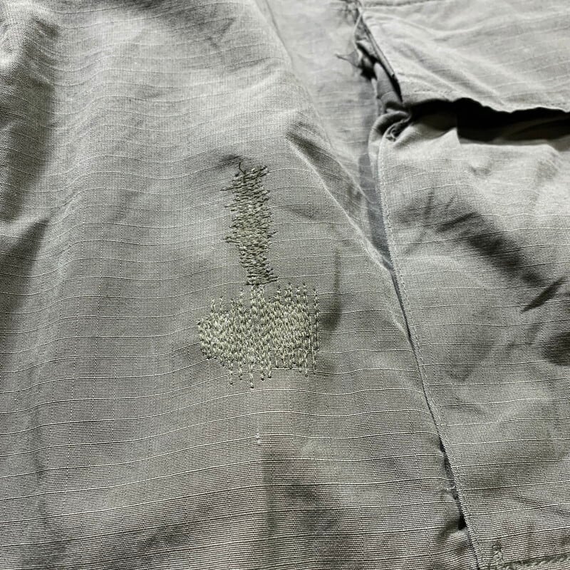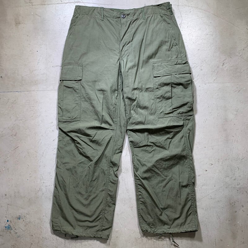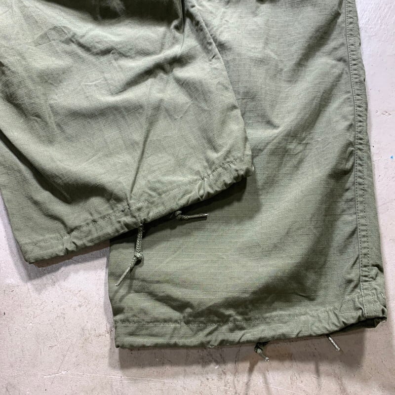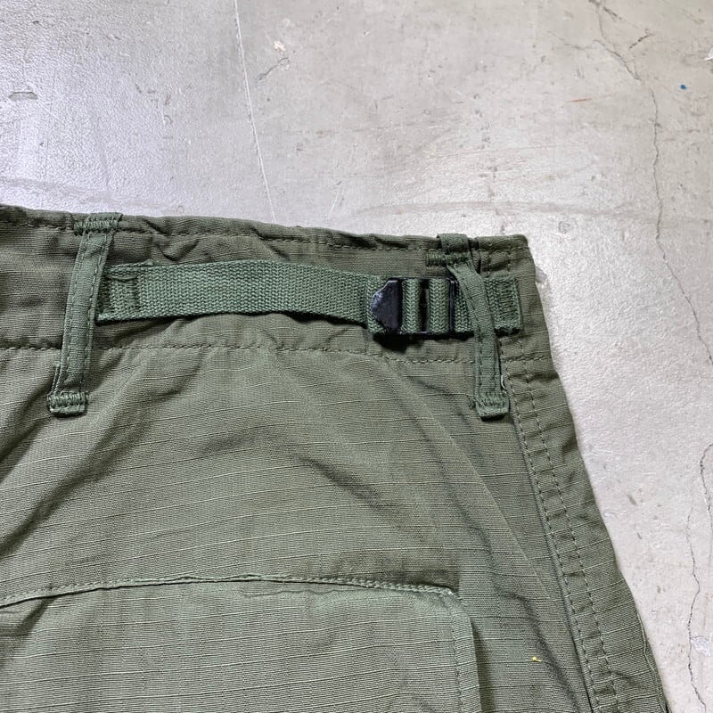 60年代のU.S.ARMYジャングルファティーグパンツです。DSA100-69-C-2600。SIDRAN SPORTSWEAR社製。フロントはSCOVILLジッパー。生地の裂け防止の為リップストップを採用した4thモデル。未使用のデッドストックで保管されていたアイテムですが、長期保管により生地にダメージが有る箇所があった為1度洗濯してリペアしています。このSIDRAN SPORTSWEAR社のこのアイテムは他のコントラクターが製造したものに比べるとやや股上が浅い作りをしていますので、すっきりとしたシルエットです。サイズは MEDIUM SHORTのゴールデンサイズ。サイドのアジャスターで、5インチほど縮めることが可能です。熱帯のベトナム戦争での使用を想定して作られている為生地感も薄手なので、夏にお勧めなボトムスです。