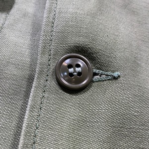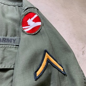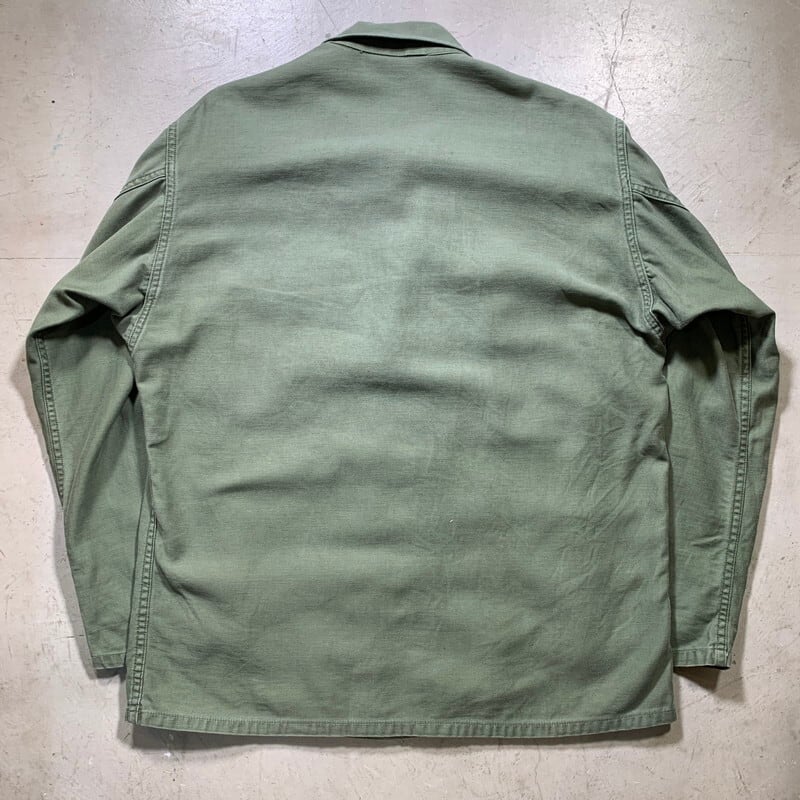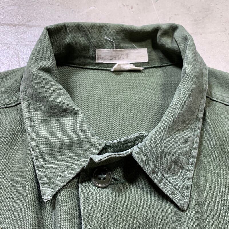 60年代のU.S.ARMY OG107コットンサテンユーティリティーシャツです。ヘリンボーンツイル地からコットンサテンへと変更になった1stモデルの後期型です。コントラクトスペックなどはスタンプからラベルへ変わり、ボタンは濃いブラウンからオリーブの尿素ボタンへ変更、フラップポケットのペン差し口無し、第一、第二ボタンの間隔が開いており6ボタン、筒袖。部隊章やネームパッチなどフルパッチ仕様です。多少使用感はございますが、ダメージ等無く状態は良好です。ゴールデンサイズのMEDIUM。1stのフルパッチは希少ですので、サイズが合う方は是非いかがでしょうか。