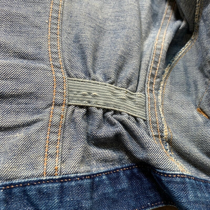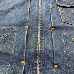 60年代頃のWrangler 11MJZデニムジャケットです。1956年に登場した11MJZは前期後期に分類されますが、こちらはその後期モデルにあたります。前期との違いはトップはスナップボタン、袖口のカンヌキ留め、内側のゴムバンドはグレーへと変更になっています。内タグは縦ベルにサイドサイズ表記。使用感はございますが、色味はまだ濃い方だと思います。右腕にダメージ、襟、袖口に擦れがございます。ポケット位置あたりの生地に濃淡がございます。その他は生地もしっかりとしおり、背面のゴムもしっかりとしています。42表記で着やすいサイズです。色落ちに定評のあるヴィンテージラングラーですので、ガンガン育てて経年変化を楽しんでみてはいかがでしょか。