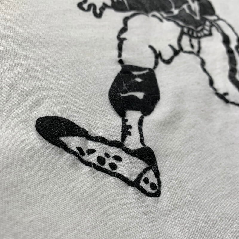 70年代から80年代頃のChampionリンガーTeeです。PIG POWERとアメフトのキャラクターがプリントされていますが、詳細は不明です。一見普通のリンガーTシャツですが、白×黒の2トーンは意外と見かけない配色だと思います。多少の使用感が有り、右肩あたりにうっすらと汚れがございます。ダメージは特にございません。シンプルなモノトーンカラーですが、少し出現率の低い白×黒は解る人には解る隠れた拘りポイントを楽しめる1着です。X-LARGE表記ですが、着丈がやや縮んでいます。軍パンにVANS等でさらっと合わせてみてはいかがでしょうか。