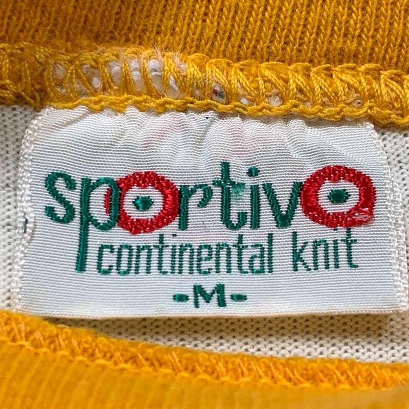 60年代から70年代頃のものと思われるsportivo太ボーダーTシャツです。イタリア語でスポーティーを意味するタグが付き、詳細は不明ですが、WPLナンバーが発行されているので、アメリカ国内で製造または販売されていたアイテムだと思われます。2.5インチ幅の太いボーダー柄で、ボディが時計回りに捩れてます。首元に小さなピンホールが有り、左脇にステッチ飛びによる小穴があります。裾のステッチかなり歪みがあるので、縫い直されているのかもしれません。袖のステッチも一部飛んでいます。汚れは無く比較的綺麗です。サイズはM表記ですが、Sサイズ寄りです。ジャスト目に着てミリタリーチノと合わせてみてはいかがでしょうか。