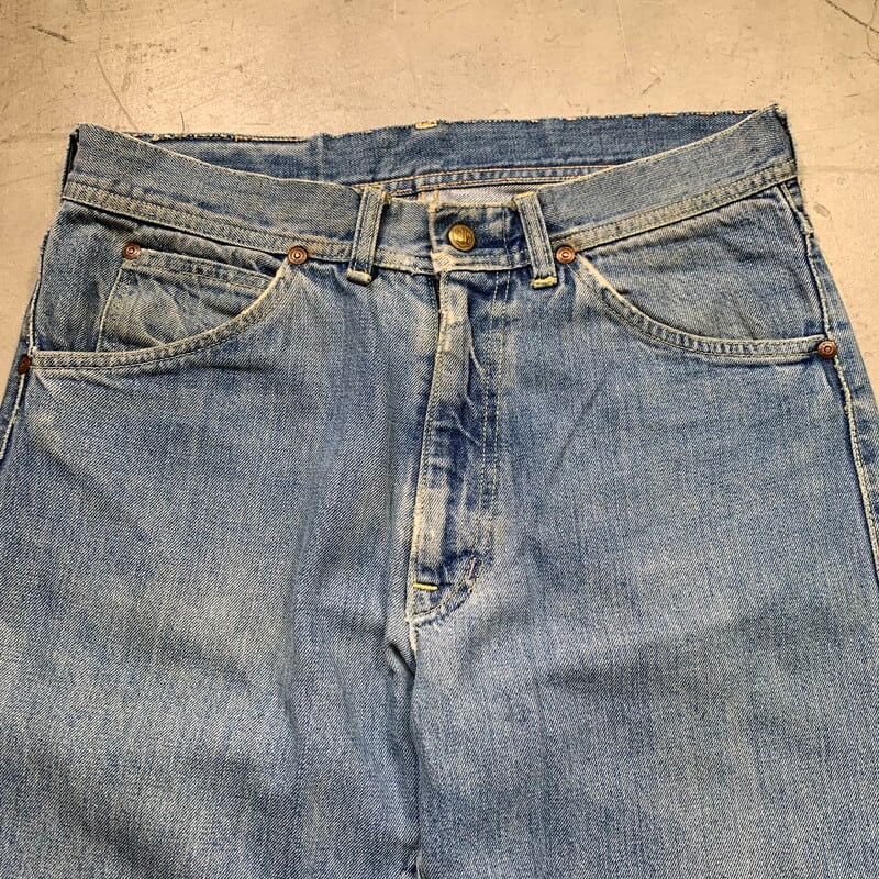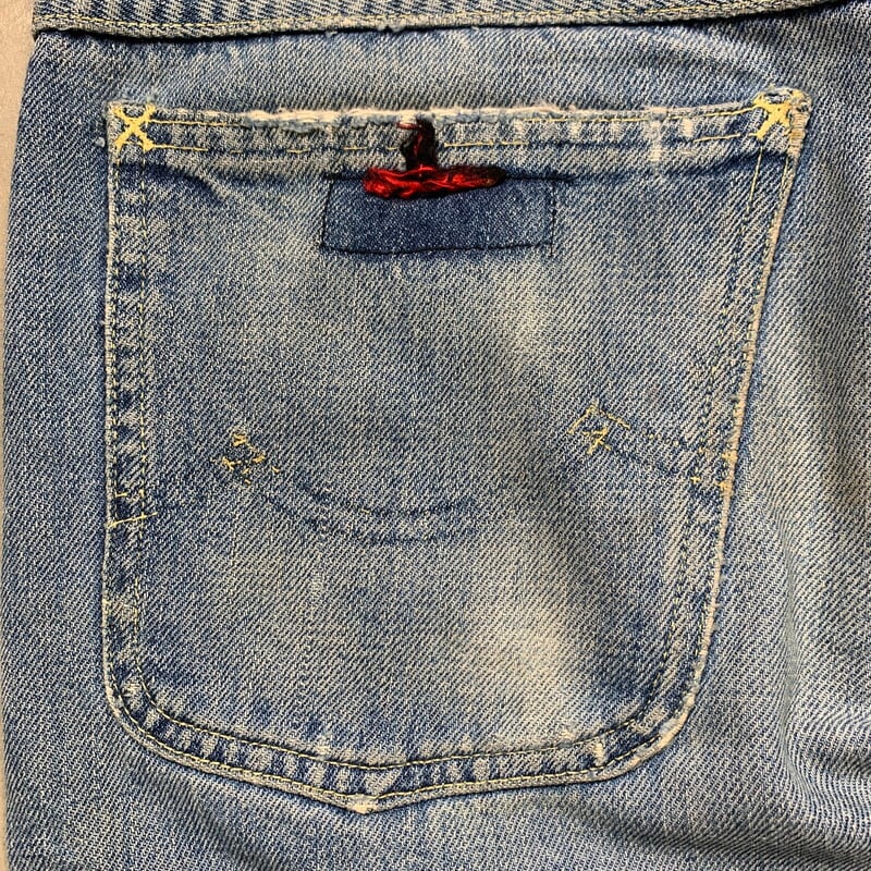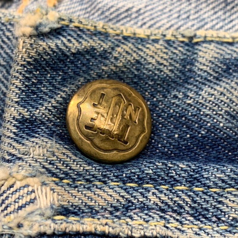 60年代頃のTUF NUT 5Pデニムパンツです。1908年アメリカのカンザス州で設立されたKEY INDUSTORIESが1920年代頃から商標を保有していたワークウェアブランドです。70年代後半にはTUF NUTの名前は消滅したとされています。トップボタンは社名入りのスナップボタン、ジッパーはTALONのセミオートマチックです。トップボタン裏はドット刻印です。アウトシームは脇割りです。バックポケットのタグがほとんどありませんが黒赤のタグがついていたと思われます。全体に色落ちしており、所々擦れによるダメージも見られます。フロントカンヌキしたのステッチが簡易的に縫い直されています。ステッチ飛びもいくつか見らえます。ワークブランド物やストア物のデニムも70年代以前の物となると見つかりづらくなっていますので、お探しだった方は是非この機会にいかがでしょうか。実寸はW32~33インチ位です。