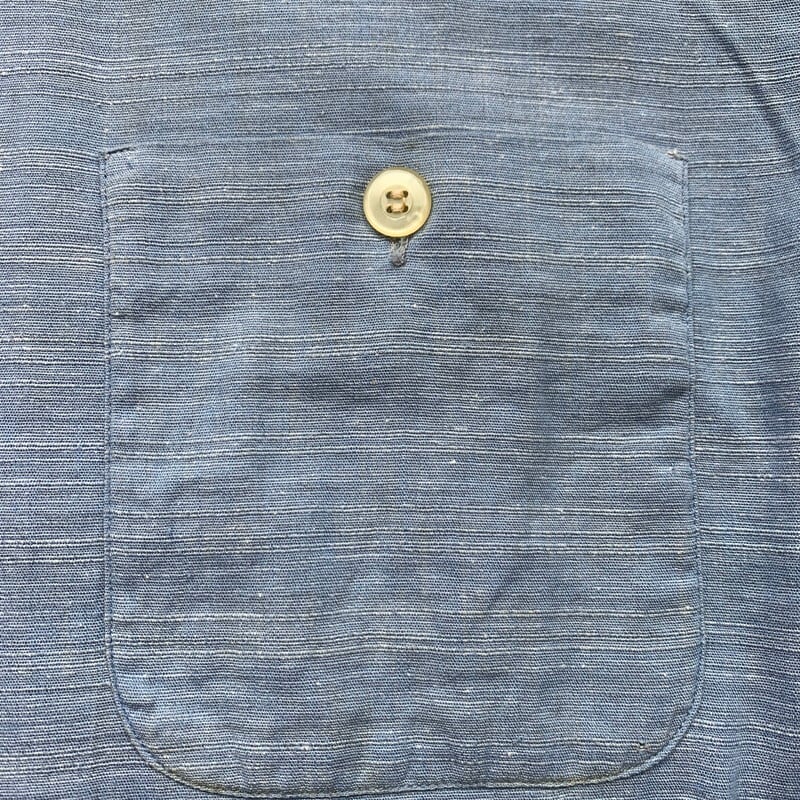 50年代から60年代頃のENENADAオープンカラーシャツです。名門の生地メーカーとして有名なDAN RIVER社のファブリックを使用したこちらは、一見無地のシャンブレーのようですが、絣柄のような凹凸のある生地が使用され、肌さわりもさらっとしています。襟は丸みを帯びた袋縫い仕様です。襟元にうっすらとした汚れがございますが、その他ダメージ等は無く良好です。この年代頃のMサイズのシャツは比較的小さめな作りをしている物が多いですが、こちらは身幅もしっかりとあり、着やすいサイズ感だと思います。長袖ですが、上記にもありますようにさらっとした質感ですので、エアコンが使われるこれからの季節に長時間室内で活動される方等にお勧めです。シンプルながら洒落たデザインの1着です。