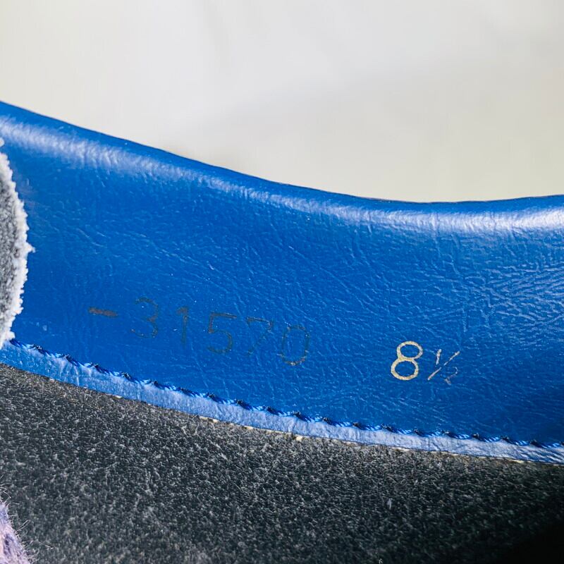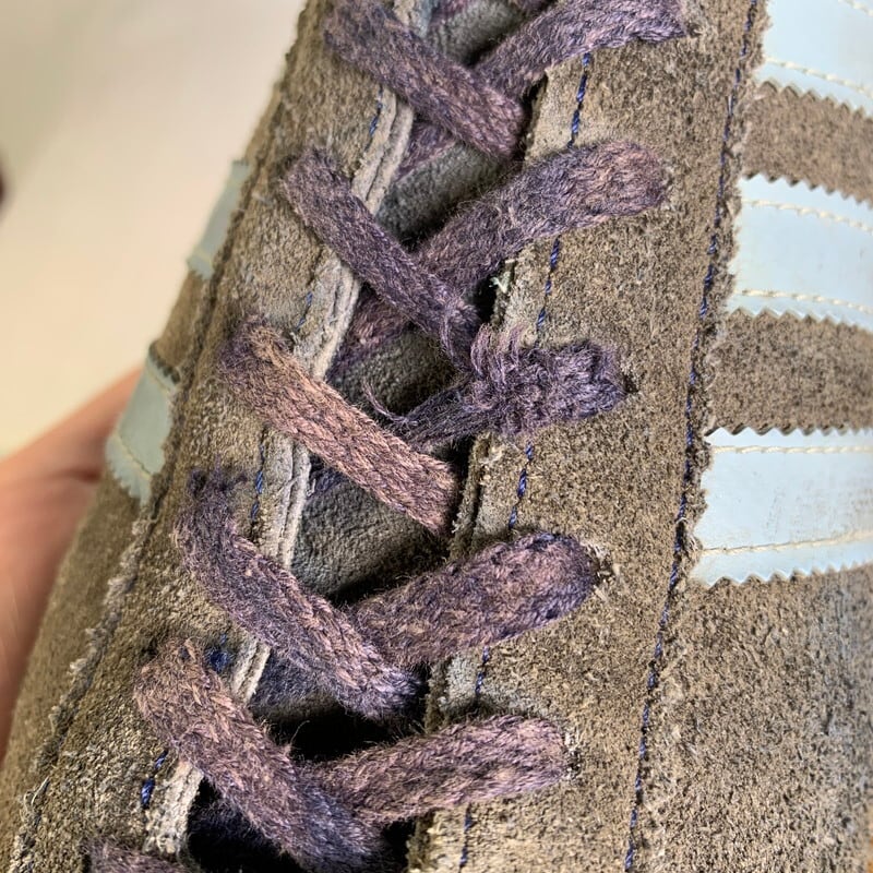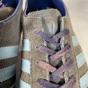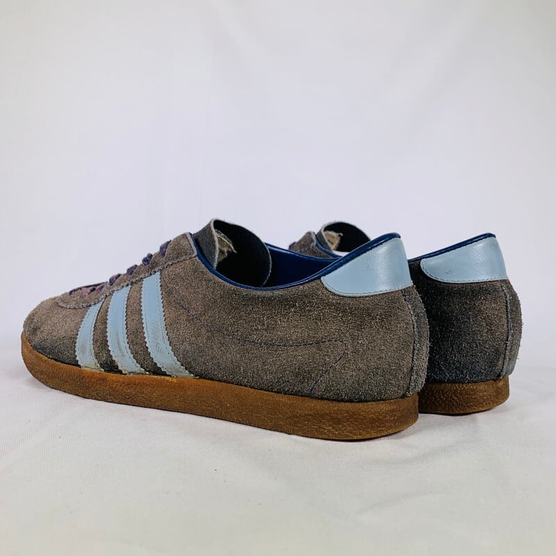 70年代頃のadidas BERLINスエードスニーカーです。復刻では無くユーゴスラビア製の当時のオリジナルです。数ある都市シリーズの中でも人気が高いモデルです。元々は濃いネイビーのスエードですが、経年による褪色で、グレーのようにフェードしています。シューレースも見事にナス紺へと変色しています。シューレースは残念ながら右足側が切れて短くなっており、左右共に途中切れかかった箇所がある為グッときつく引っ張ると切れてしまう恐れがございます。内張りはレザーで1カ所地さなクラックが見られます。褪色やシューレースのダメージはございますが、この年代のスニーカーとしては状態は良好といえます。内側サイドに8 1/2表記があり、恐らくUK規格の8.5なので27.5cmだと思われますが、やや小さめなので普段26~26.5cmを履いている方に合うサイズです。褪色具合も相まってヴィンテージらしい雰囲気が抜群に良い1足です。ソールの硬化も無くしなります。古いadidasスニーカーがお好きな方は是非コレクションにいかがでしょうか。オリジナルは大変希少です。