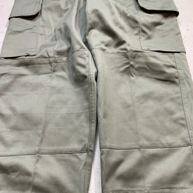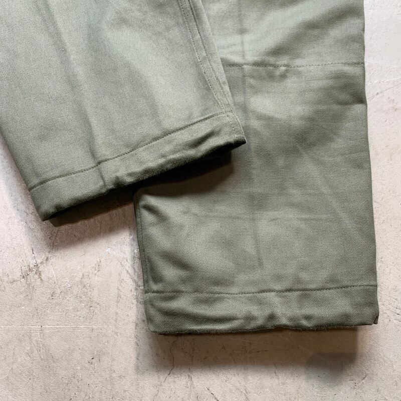 70年代のフランス軍M64フィールドパンツです。光沢のあるコットンサテンを使用したこちらはM47の後継モデルとして1964年に採用されたモデルです。M47はズドンと太いストレートですが、こちらのM64はテーパードが利いたストレートシルエットで、ミリタリー特有の野暮ったさは無くすっきりとした印象です。バックにはポケットが付かず、左背面にステンシルが入ります。裾裏には泥除けのの目的なのか、ライトオンスの生地が付属しています。使用感は少なくダメージや汚れの無いミントコンディションです。都会的なファッションにも合わせやすい今っぽいシルエットでオススメです。