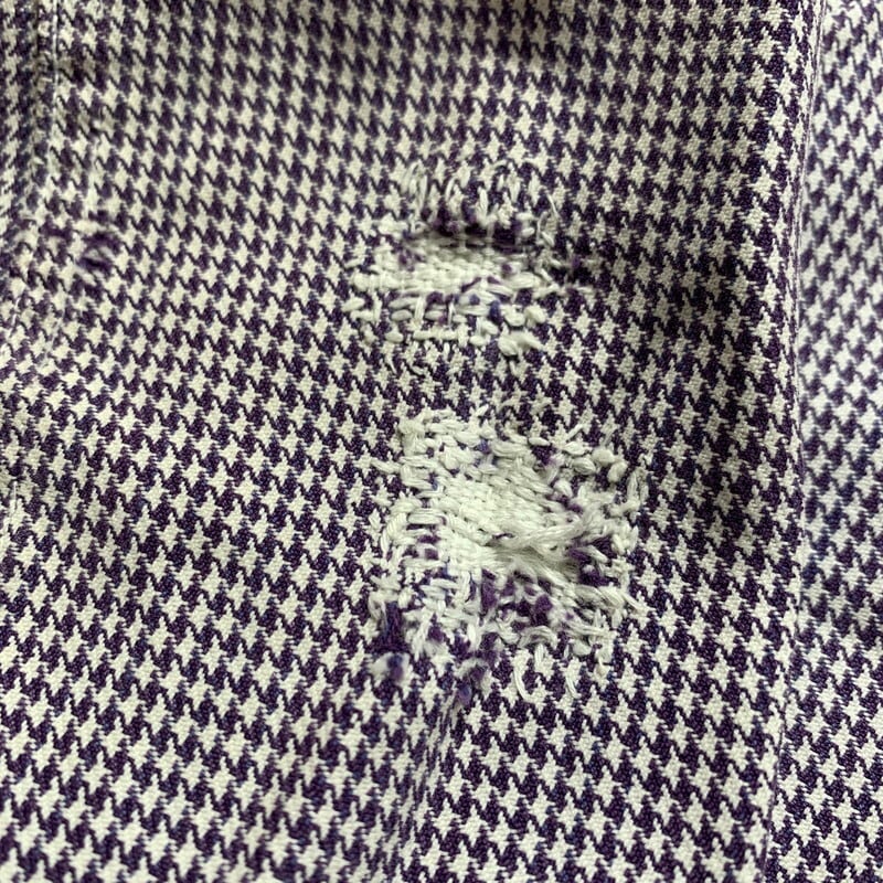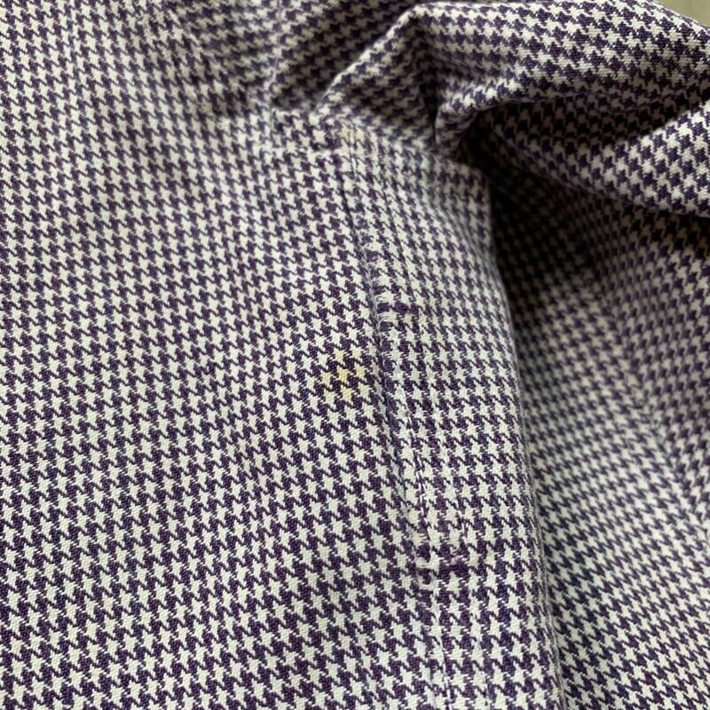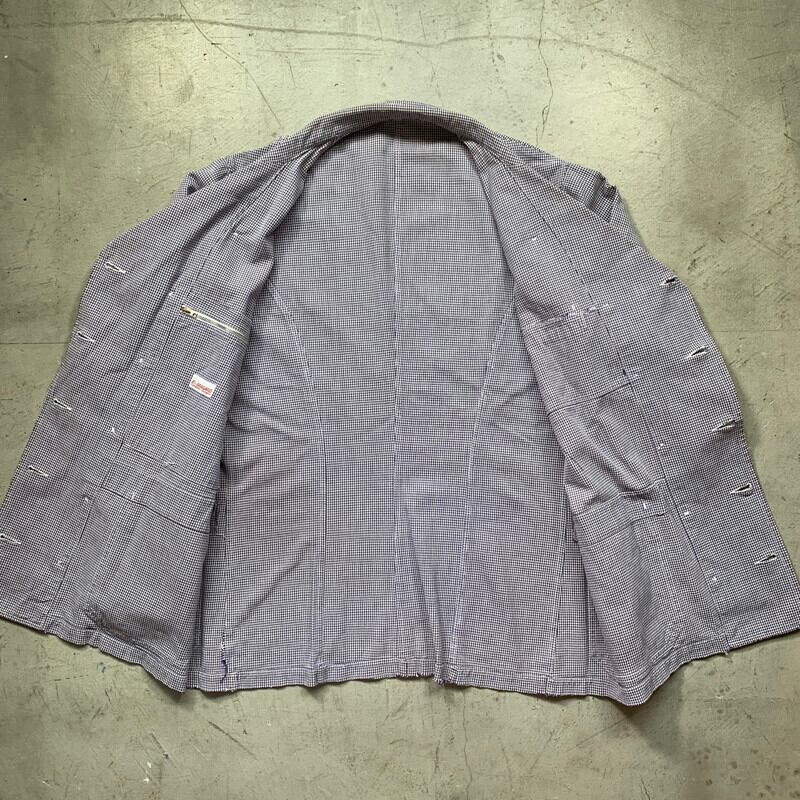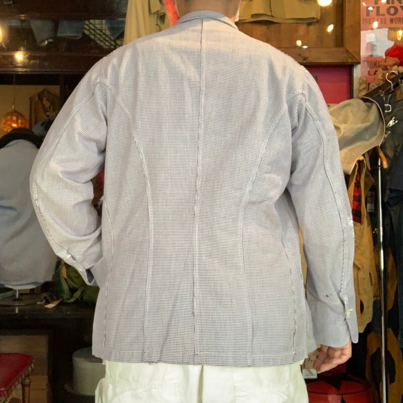 50年代頃のEts.BRAGARDダブルブレスドブッチャージャケットです。一般的にフレンチコックジャケットとして知られるこちらは、1933年に設立されたホテルマンやサービス業のワークウェアを製造する老舗です。ホワイトにパープルの千鳥格子柄が織り込まれており、目の詰まった滑らかな肌触りです。フロントはダブル仕様で、左右どちらでも入れ替えるかとが出来ます。ボタンはシェルで、2個ほど端が欠けていますが着用に支障はございません。右袖ににダメージが有り、刺し子のようにハンドリペアが施されています。襟や裾の縁に擦れが見られ、小さなダメージもございます。サイズ表記は判読不明ですが、MからL位。170cm70kgのスタッフで、袖や着丈は丁度良く、身幅は若干タイトに感じたので、フロントを開けての着用なら良いバランスでした。シルエットの綺麗なジャケットなので、1着あると何かと使えるアイテムです。