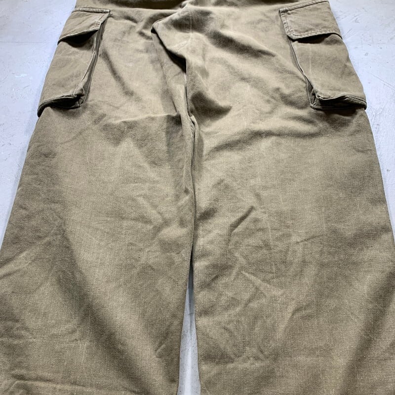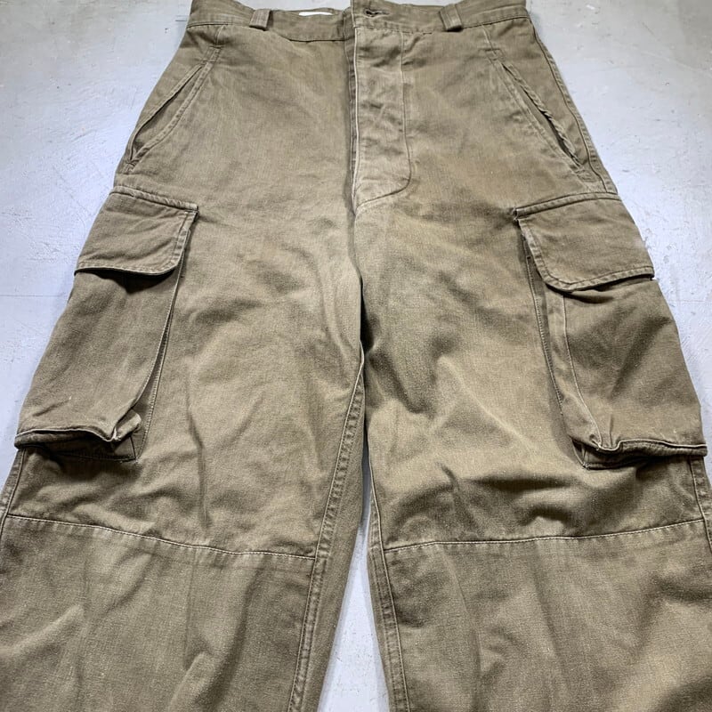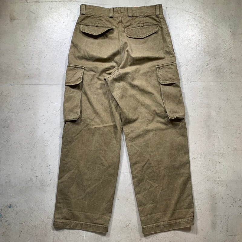 60年代頃のフランス軍M-47カーゴパンツ後期型です。前期型との違いはヘリンボーン地を採用、少しテーパードが入り米軍のカーゴパンツに比べ野暮ったさも無くワイドながらもすっきりとしたシルエットが特徴です。サイドポケットはマチがあるのでたっぷり収納できます。内側のスタンプはほとんど消えているので判読不可。サイズ表記は41、実寸はW31インチ位ですので女性も穿きやすいと思います。若干の色褪せや使用感はございますが、ダメージもほとんど無く良好です。ユーロミリタリーの中でも人気、知名度の高さは群を抜いたアイテムです。綺麗目な白シャツに黒の短靴でさっぱりとしたコーディネートにいかがでしょうか。