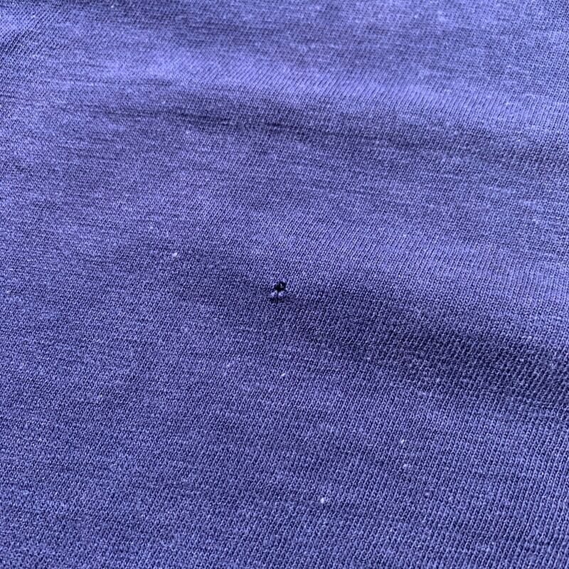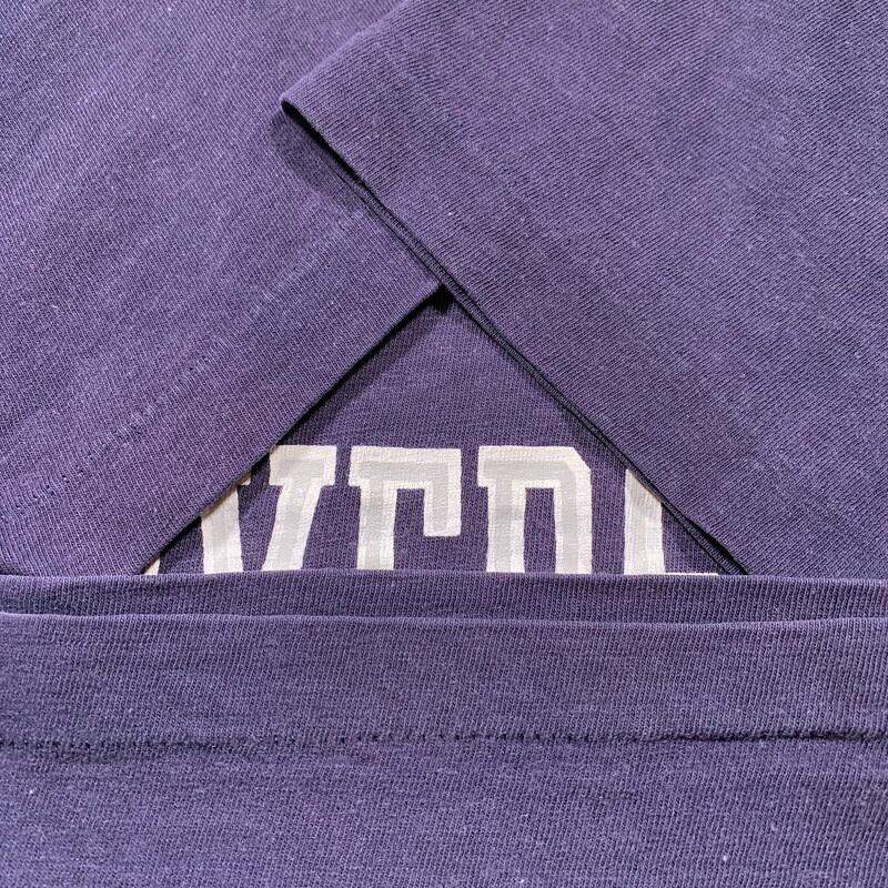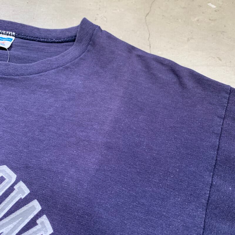 70年代から80年代頃のChampionカレッジTシャツです。1789年にワシントンD.C.の郊外のジョージタウンで設立された名門大学のラバープリントが入る1着です。後期のバータグが付きます。袖、裾共にシングルステッチ。程よくフェードしており、ナス紺まではいきませんが良い雰囲気です。LARGE表記ですが、着丈は短めです。肩付近にヤケがあり、腹部に1カ所ピンホールがございます。ボディの撚れは少なく状態は良好です。短丈なので、ジャスト目で着たり、女性でも着やすいアイテムです。ネイビーカラーのTシャツはミリタリー物とも相性が良いのでお勧めです。
