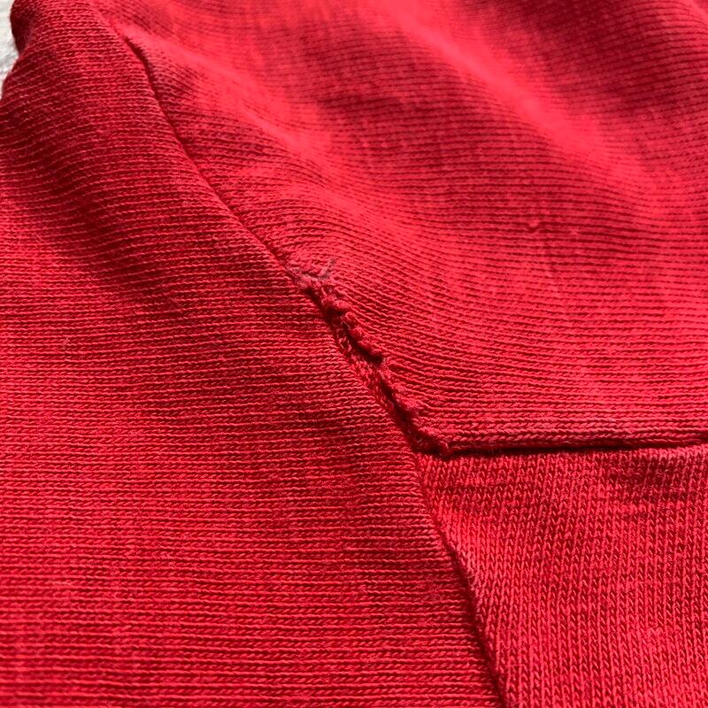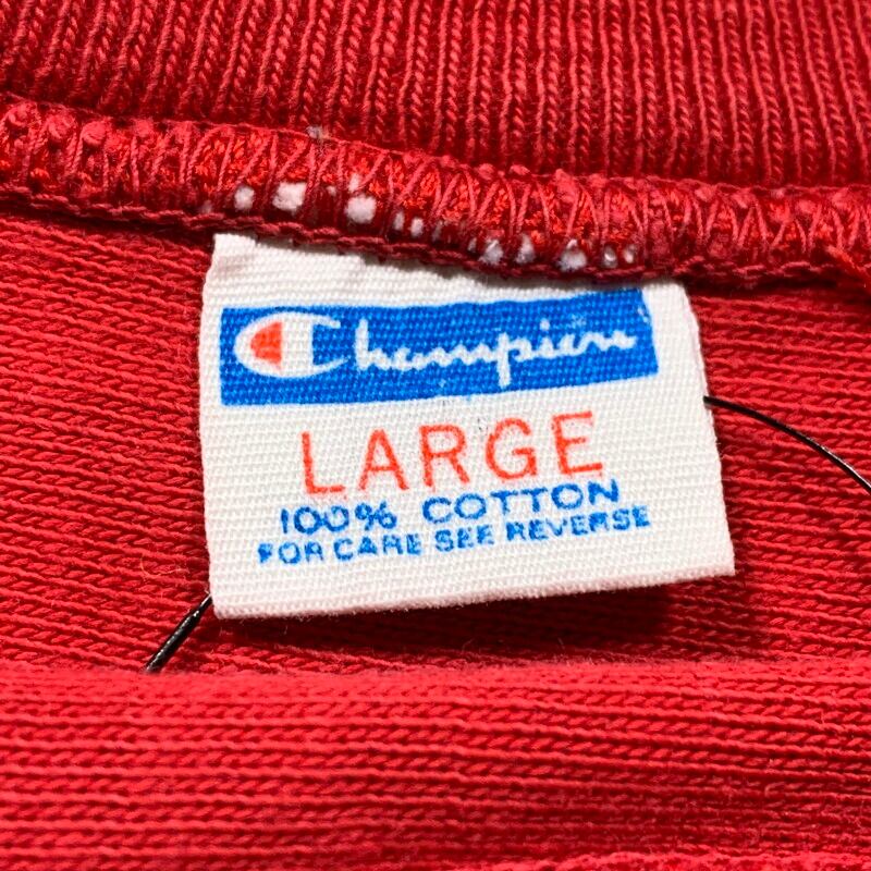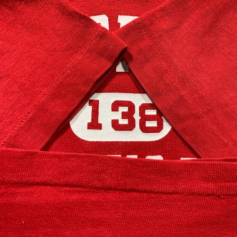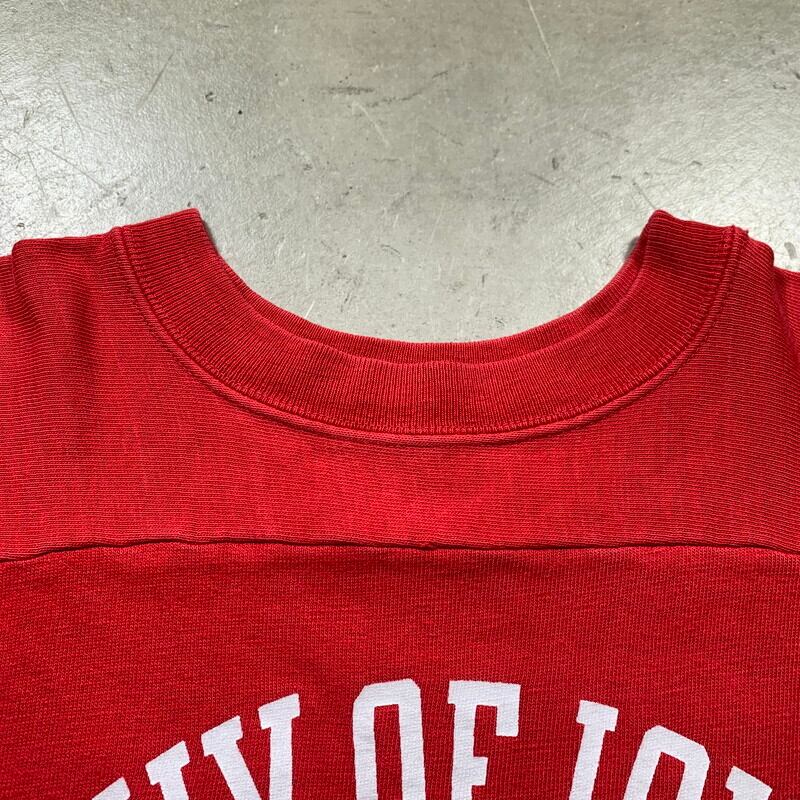 70年代から80年代頃のChampionフットボールTeeです。アイオワ大学の陸上部のプリントが3段で入ります。肌ざわりの良いコットン100%ボディです。ピンホールが2か所と左肩後に生地がめくれたようになった箇所はございますが、プリント割れも無くコンディションが良い1着です。希少なCHAMPION PRODUCTS INC表記で、サイズはLARGEです。真っ赤というよりは少し褪せたような赤(1つ前の物に比べるとわずかに暗め)なので合わせやすいと思います。状態も良好で、着やすいサイズ感なのでお探しだった方は是非いかがでしょうか。