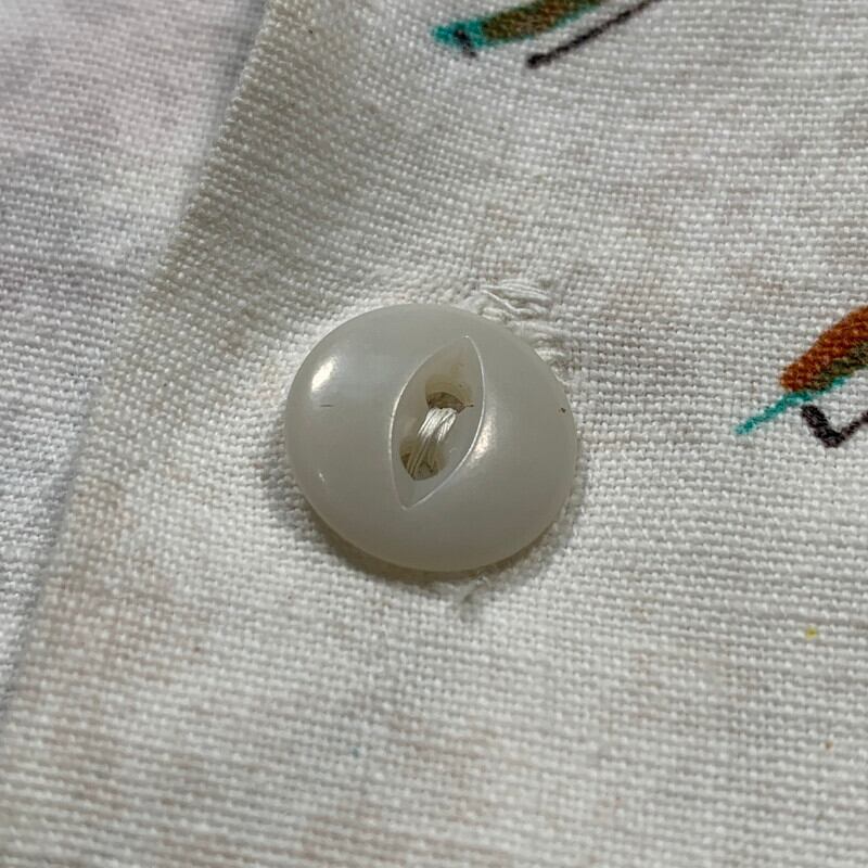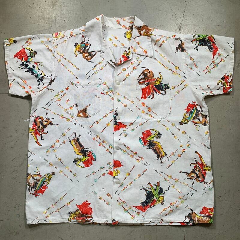 50年代頃の物と思われるマタドール柄コットンオープンカラーシャツです。華麗な姿で牛をかわす闘牛士の姿が描かれています。タグは付かず、ステッチの具合からもしかするとハンドメイドかもしれません。しかし袋縫いの襟やポケット等丁寧に仕上げられています。フロントは全て猫目ボタンが使用されています。袖と着丈が短めで身幅ゆったりなボックスシルエットです。2013年某ストリートブランドがこのデザインをサンプリングしたアイテムを販売しており、こちらのファブリックが元ネタと思われます。背面に1カ所小さなハンドリペアがございますがその他目立つ汚れ等も殆ど無く状態は良好です。袖が短い作りをしているので、インナーにはタンクトップ等を合わせてみてはいかがでしょうか。