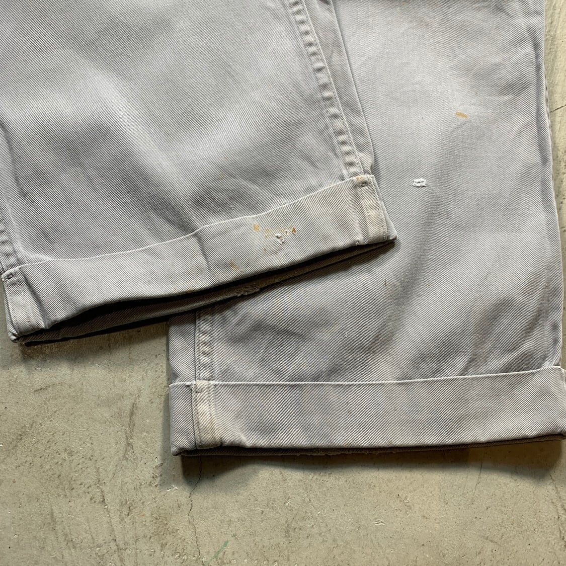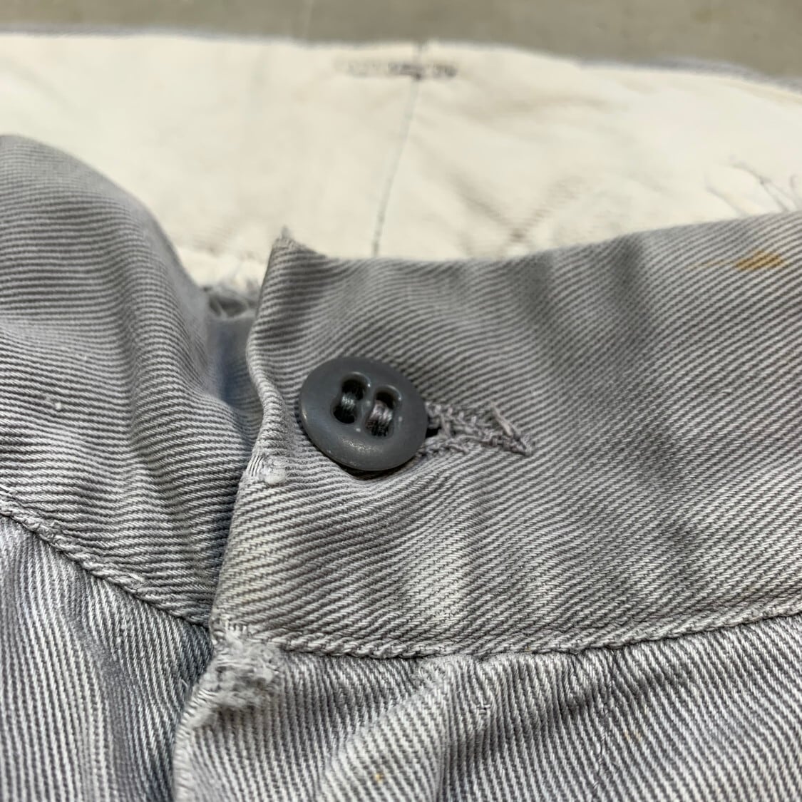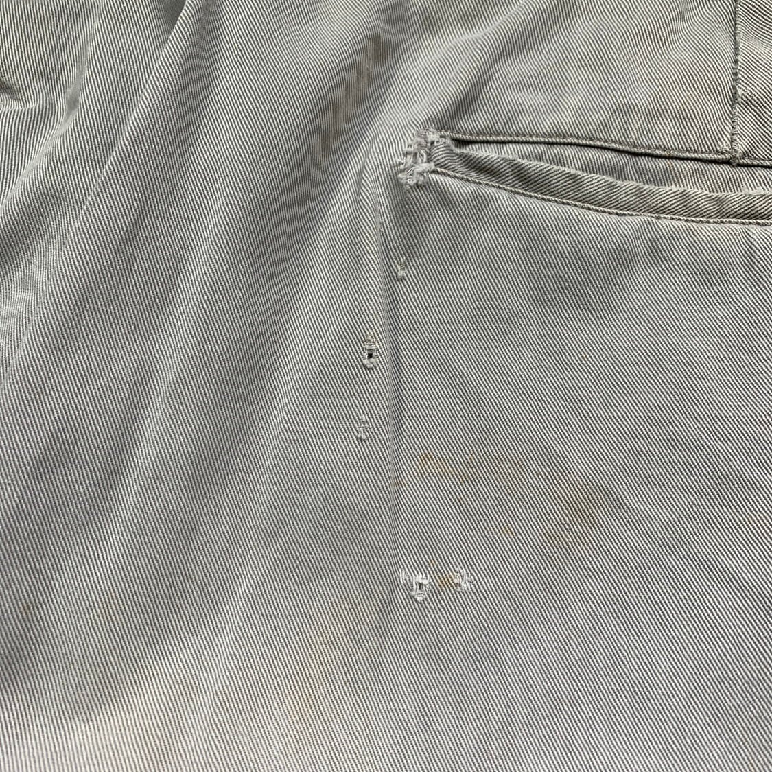 50年代から60年代頃のBIG MACワークチノトラウザーズです。アメリカを代表する3大ストアのJC Penneyが展開するプライベートブランドです。BOAT SAIL CLOTHと呼ばれるコットンツイル地が使われたアイテムです。全体的に使用感が有り、所々穴や擦れ、汚れ等のダメージが見られます。通常グレーのチノはのっぺりとした印象ですが、随所にみられるダメージも相まってワークウェアらしい無骨な雰囲気の1っ本となっております。ウエストはおおよそW32インチ。普段W30~31インチ位のパンツを穿いていらっしゃる方に丁度良いのでは無いでしょうか。リペアを楽しんだり出来る方にお勧めな1本です。