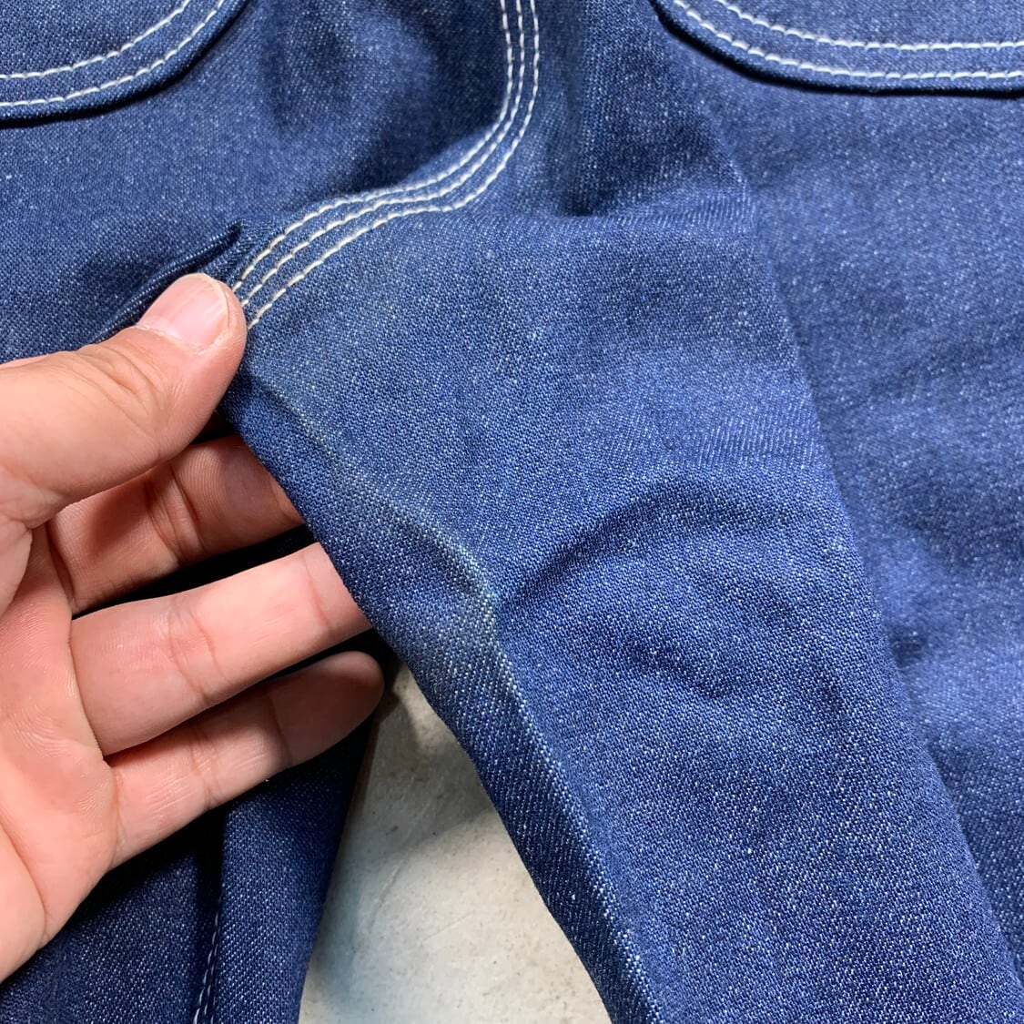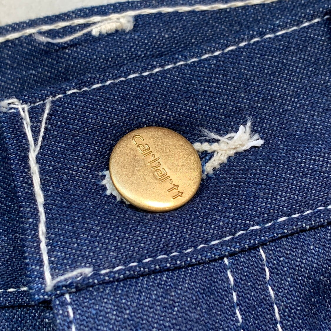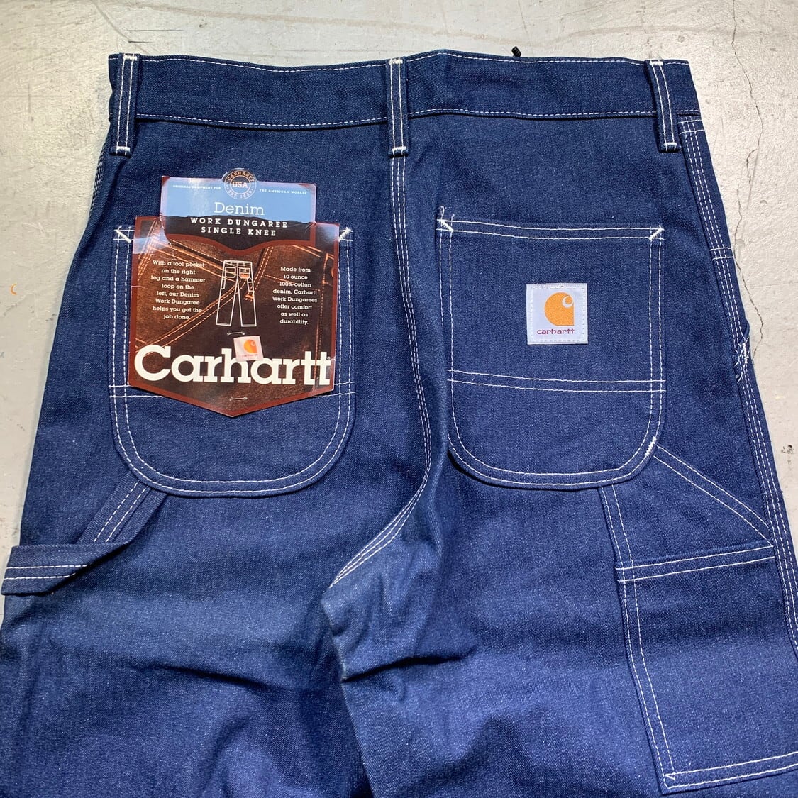 80年代頃から90年代頃のCarharttデニムペインターパンツです。1984年に発足したCrafted with Pride in the U.S.A. Councilの星マークが入るタグが内側に付き、アメリカ国内で製造された事を示します。フラッシャーが付くデッドストック未使用品で、ダブルニーではない通常のペインタータイプです。フロントはYKKのセミオートマチックジッパーが使用されています。デッドストックですが、長期保管による畳みヤケがうっすらと見られますが、気にならない程度だと思います。フラッシャーに一部破れがございますが、しっかりと取り付けられています。W30インチですので、すっきりとしたシルエットで着用していただけます。この年代あたりのUSA製モデルはまだ探せば見つかりますが、デッドストックとなると希少だと思います。サイズが合う方は是非コレクションにいかがでしょうか。