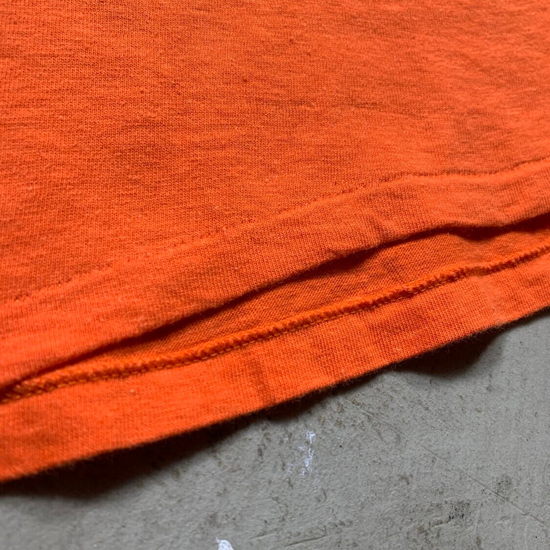70年代から80年代頃のChampionプリントTシャツです。メリーランド州ボルチモアのTangerine Machineというソフトボールチームのプリントが入ります。Tangerineとはオレンジの1種なので、チームカラーもオレンジを使用していたのでしょう。後期のバータグが付きLサイズ。後身頃が若干短いですが、良いサイズ感だと思います。多少の毛玉等使用感が見られ、右方に小さな汚れがございます。ダメージは無く良好です。綺麗なオレンジ色なので真夏に映える1着でオススメです。