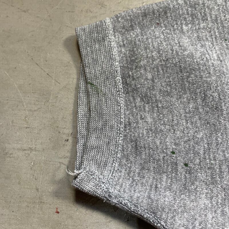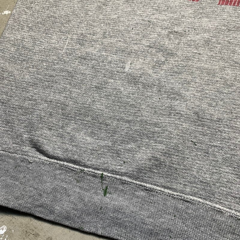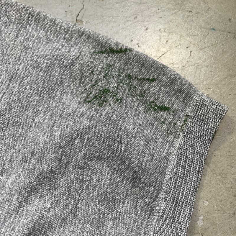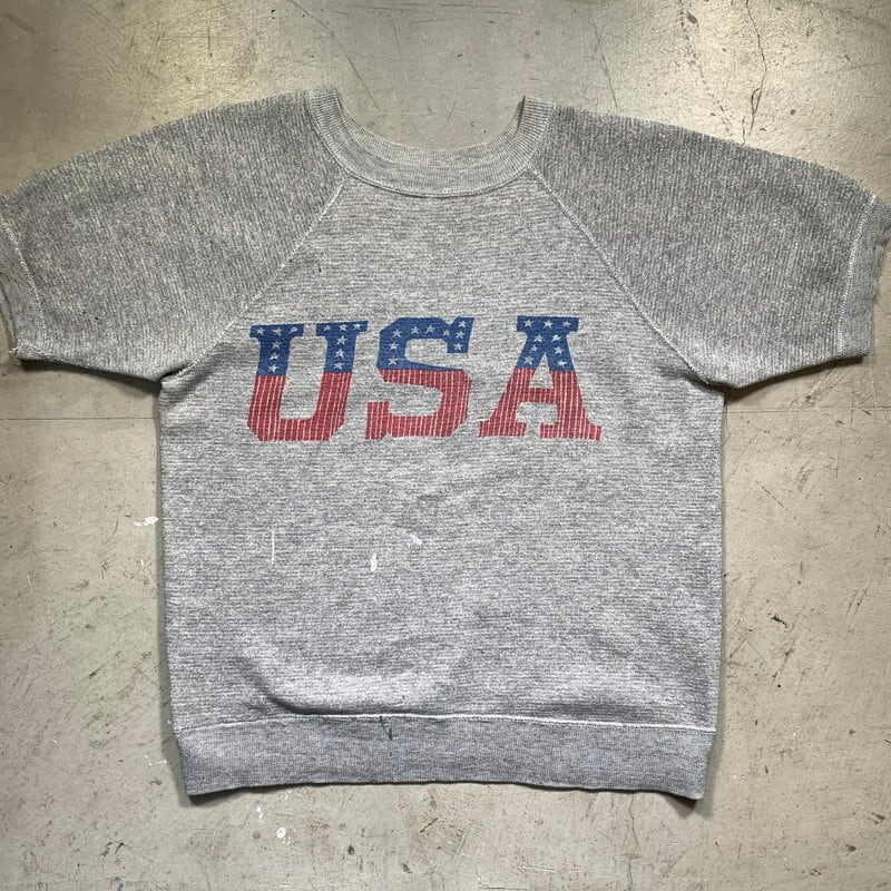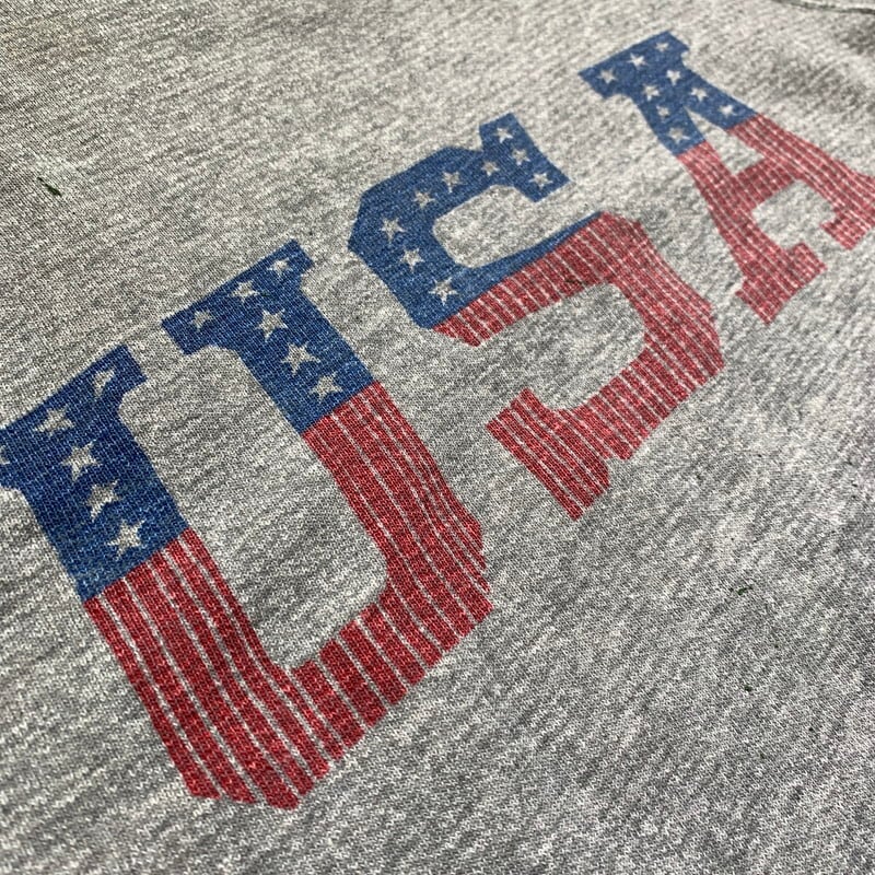 60年代から70年代頃の半袖スウェットシャツです。タグ欠損の為ブランド名は不明ですが60年代頃のHANES WIND SHIELDのスウェットの作りにとても良く似ています。フロントに大きくUSAの染み込みプリンが入るデザインで、1つ前のVOTE Tee同様に星条旗柄となっています。左脇に若干ステッチのほつけが見られます。フロントと両袖にペンキ飛びがございます。薄汚れも一部ございますが、ペンキ飛び意外は比較的綺麗な個体です。サイズはS~M程度です。生地は伸びきっていないので、幾分スチームアイロンで伸ばせばサイズアップは可能かもしれません。アメリカンでPOPなデザインがお好きな方は是非いかがでしょうか。