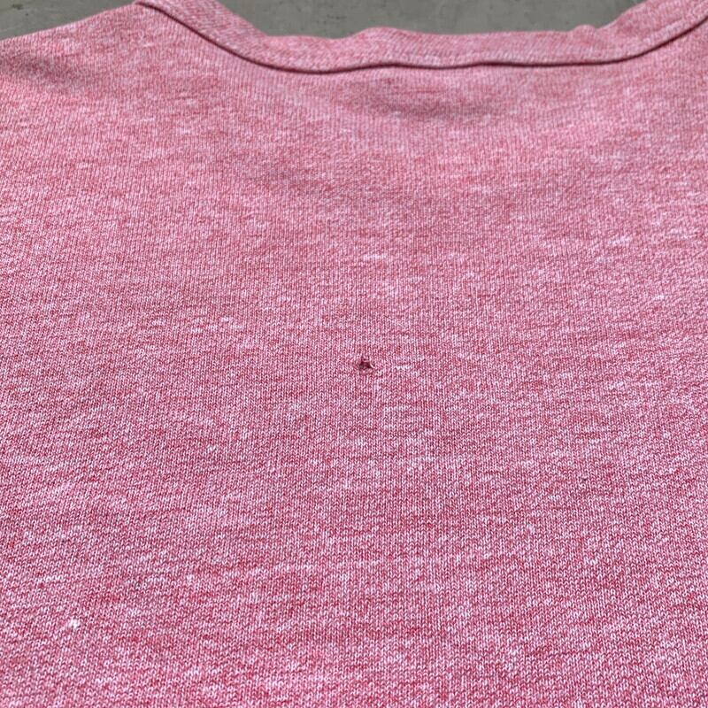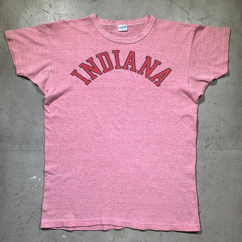 70年代から80年代頃のChampionカレッジTシャツです。コットン88%、レーヨン12%の通称88/12と呼ばれるこちらは、赤杢ボディに染み込みプリントが入ります。INDIANAと入りますので恐らくインディアナ大学のカレッジTeeだと思われます。後期のバータグが付きます。袖が短めで、長い袖が苦手な方には良いかと思います。右袖と背中の真ん中付近に小穴が開いてます。その他使用感はございますが、汚れなどは無く状態は良好です。サイズはLARGEで、着丈は長めです。縮みは少なく比較的大きさのある個体だと思います。杢カラーはデニムからミリタリー等幅広く合わせやすいアイテムですので、お好きな方は是非いおかがでしょうか。