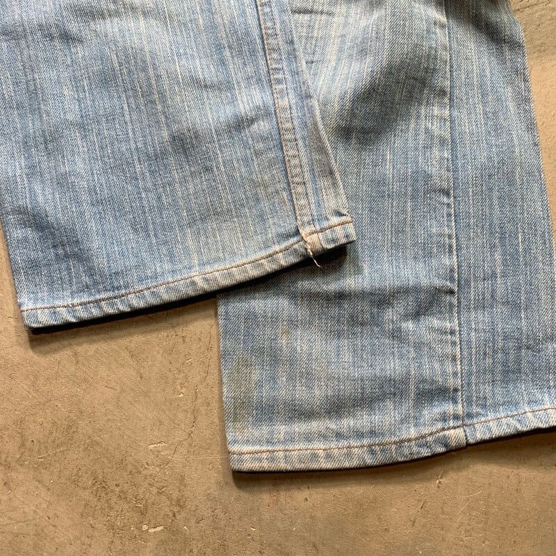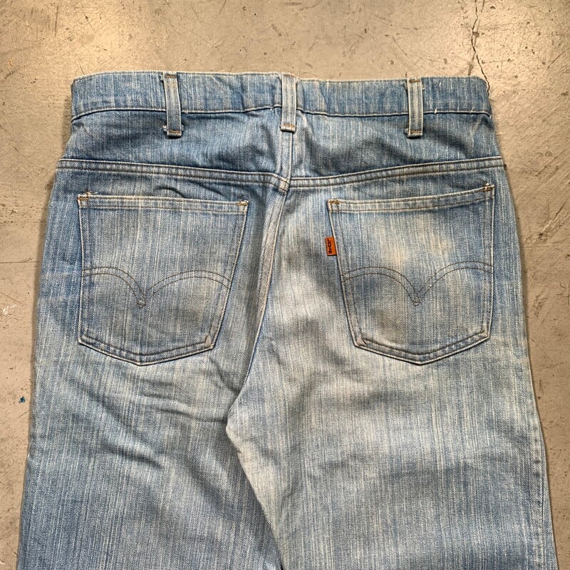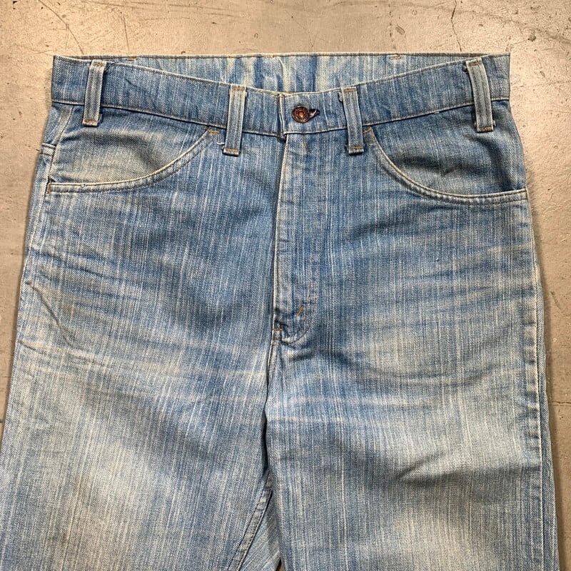 70年代のLevi's 519-2913デニムパンツです。77年製造のUSA製。今回ご紹介するこちらは元から縦落ちしたデニムが使用されており、同年頃の他のモデルでもいくつか同じ生地の物をたまに見かけます。やはりデニム地の519自体見つかりづらいとは思いますが、このタイプはさらに出現率低めだと思います。ボタン裏刻印563、42TALON、スモールeオレンジタブ。程よく穿き込まれてヒゲも確認できます。薄いシミ等はございますが、ダメージやリペアの無いグッドコンディションです。サイズ表記はW34。実寸はW33~34の間位です。スウェードやコーデュロイなど茶系のトップスと相性も良いのでこれからの季節にお勧めな1本です。