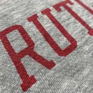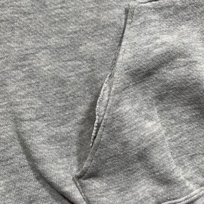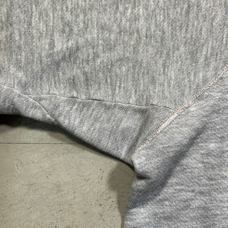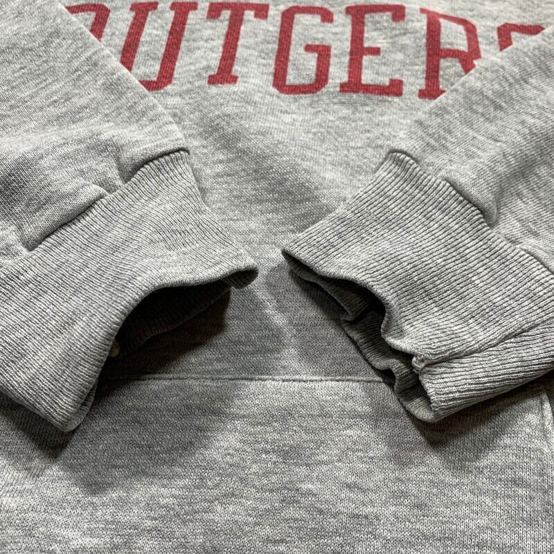 70年代頃のChampionスウェットパーカーです。リバースウィーブでは無いラグランスリーブのモデルです。フロントには染み込みプリントでRUTGERSと入り、ニュージャージー州のRUTGERS UNIVERSITYのカレッジ物と思われます。素材は同時期のリバースウィーブと同じコットン84%、アクリル10%、レーヨン6%です。ハトメはアルミのシルバータイプで、左側にへこみがございます。リバースウィーブ同様にこの年代あたりまでに見られる小ぶりなフードが特徴です。フード付け根にややダメージがございます。このラグランスリーブ型のスウェットパーカーは縮みがあるものが多いですが、こちらの個体は比較的サイズは残っていると思います。シンプルなグレーなので、幅広く合わせていただけます。
