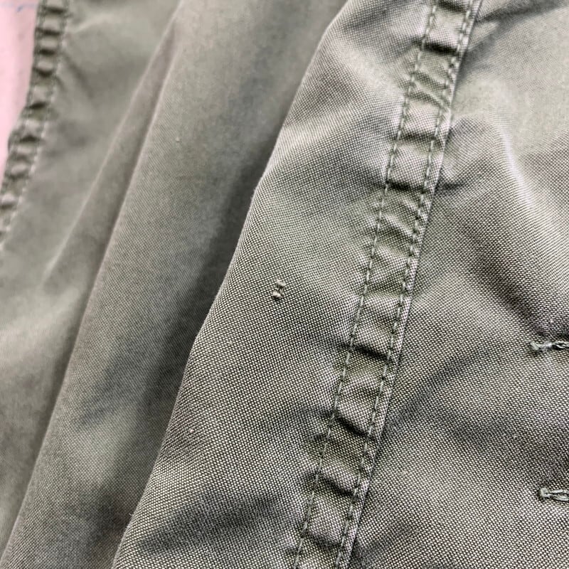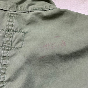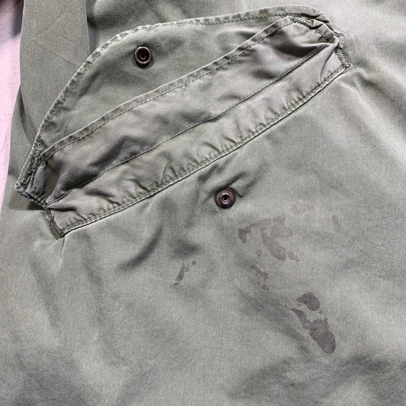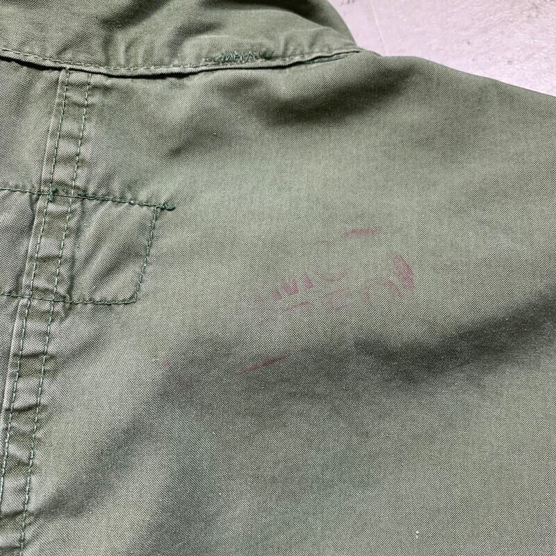 70年代のPARKA EXTREME COLD WEATHER フィッシュテールパーカーです。コントラクターはVANDERBILT SHIRTS CO INC。ミルスペックはDLA100-74-C-0168。M-1951モッズコートの後継モデルのこちらは、フード、ライナーが付かないシェル本体のみとなっています。フロントは社名刻印の入らないブラスジ1ッパーが採用されています。右ポケットと裾付近にシミ汚れがあります。左袖口のボタンが1欠損しています。背面首元にスタンプが押され、腰のステッチ上部に小さなピンホール、下部に1ヵ所リペアが見られます。その他使用感はございますが、まずまず良好だと思います。サイズはMEDIUMですのでほとんどの方に着用していただけます。男女共にオススメな1着です。