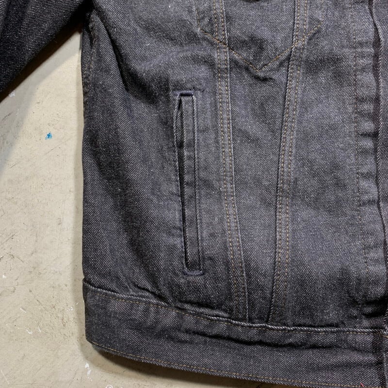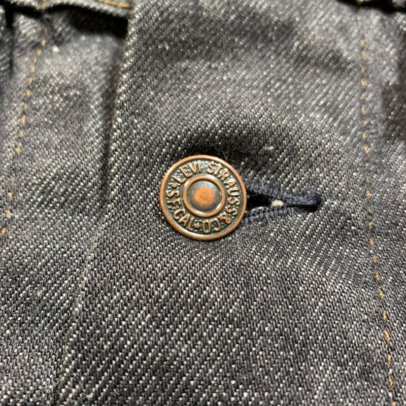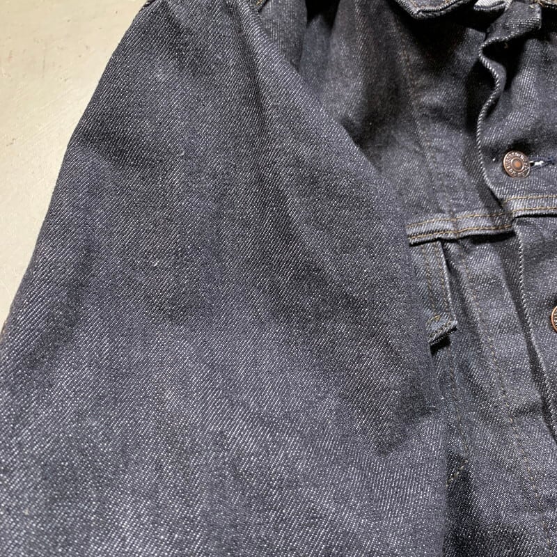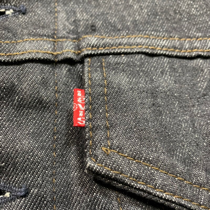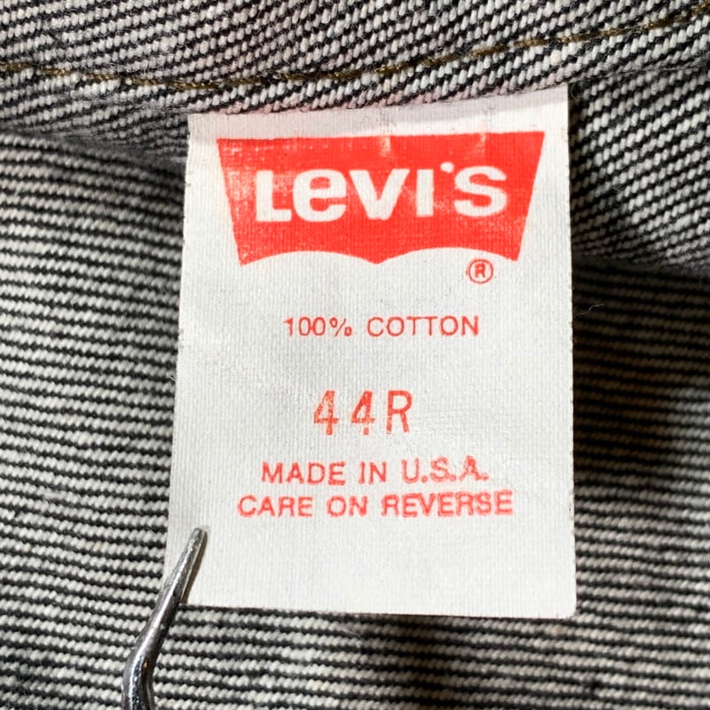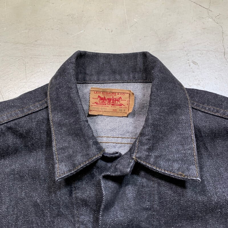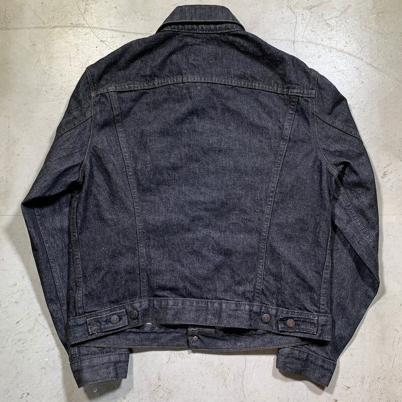 80年代後頃のLevi's 70506-0259ブラックデニムジャケットです。70505の後継モデルでハンドウォーマーポケットが付くモデルです。こちらは、インディゴのデニムでは無くブラックデニムが使用されたモデルで、インディゴに比べ珠数の少ない希少なアイテムです。水に通った回数も少ない濃い濃いのミントコンディションです。紙パッチに一部欠損有り。元々両腕にワッペンが付いていたようですが綺麗に取り除かれています。ワッペンが付いていた場所は色の濃淡の差は特に無いのであまり気にならないと思います。その他ダメージや汚れはございいません。サイズは44Rと需要の高い大き目サイズです。グレーのように色落ちした個体は見かけますが、ここまで状態の良い物はなかなか見つからないと思います。リーバイスは全体的に価格高騰傾向にありますので、お探しだった方でサイズが合う方は是非この機会に是非いかがでしょうか。