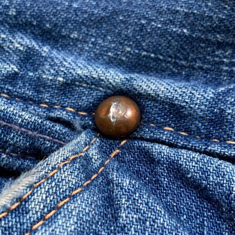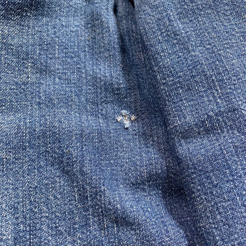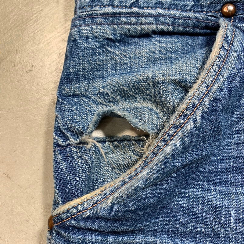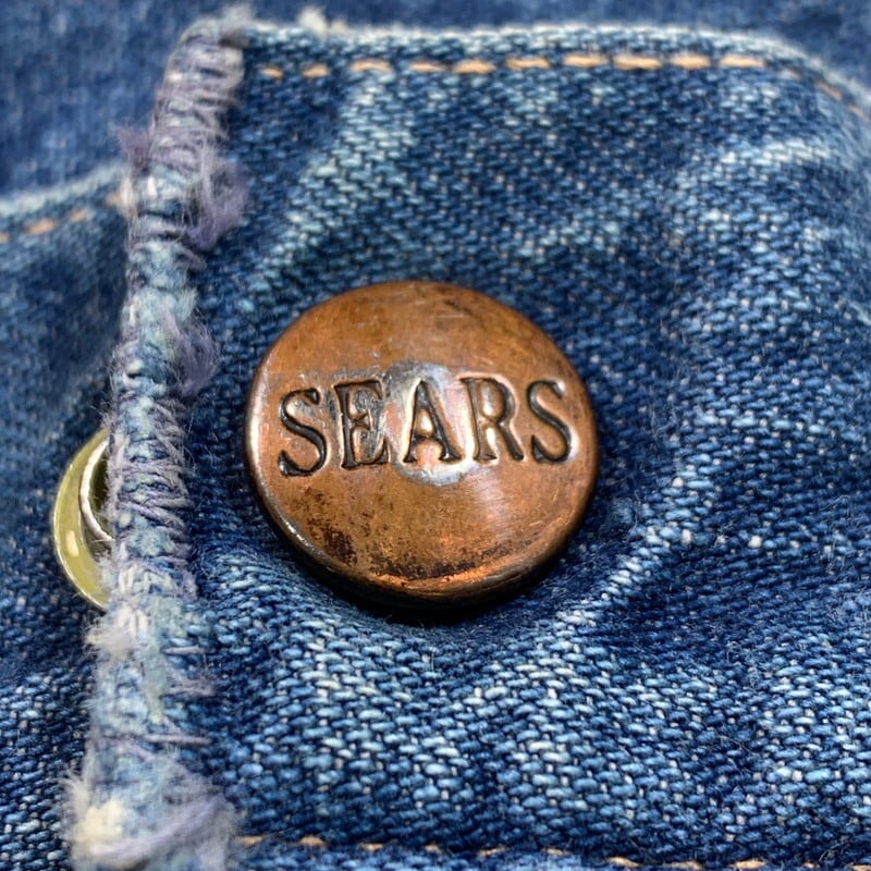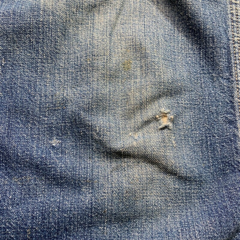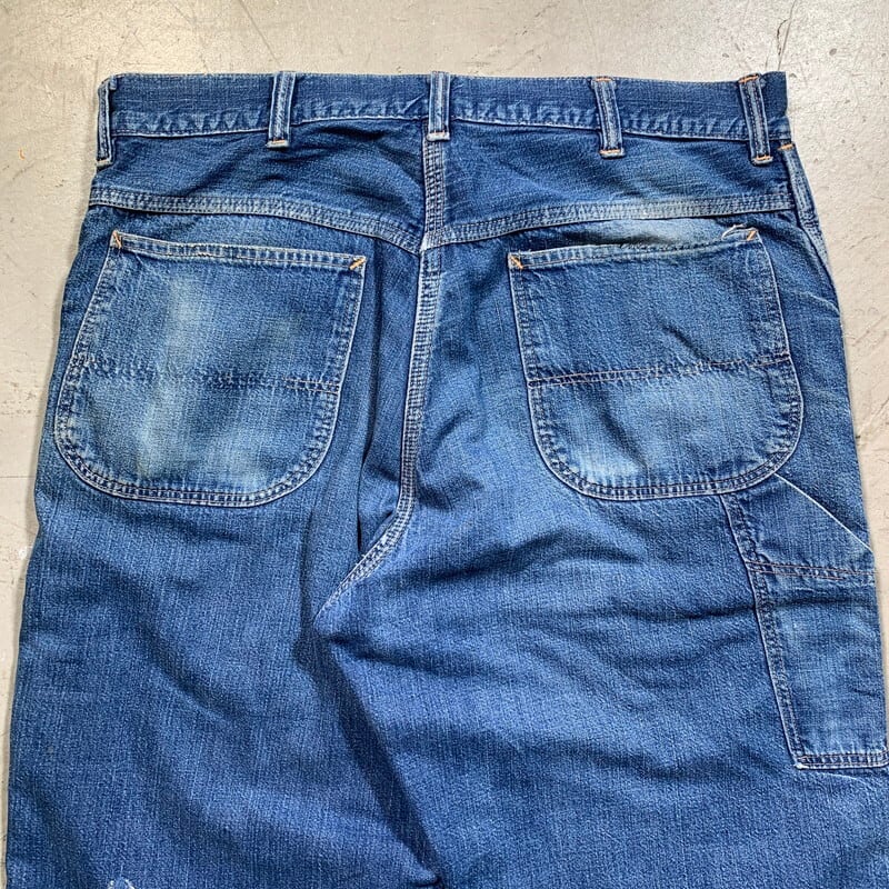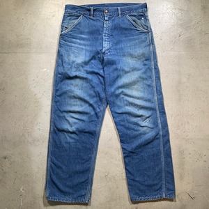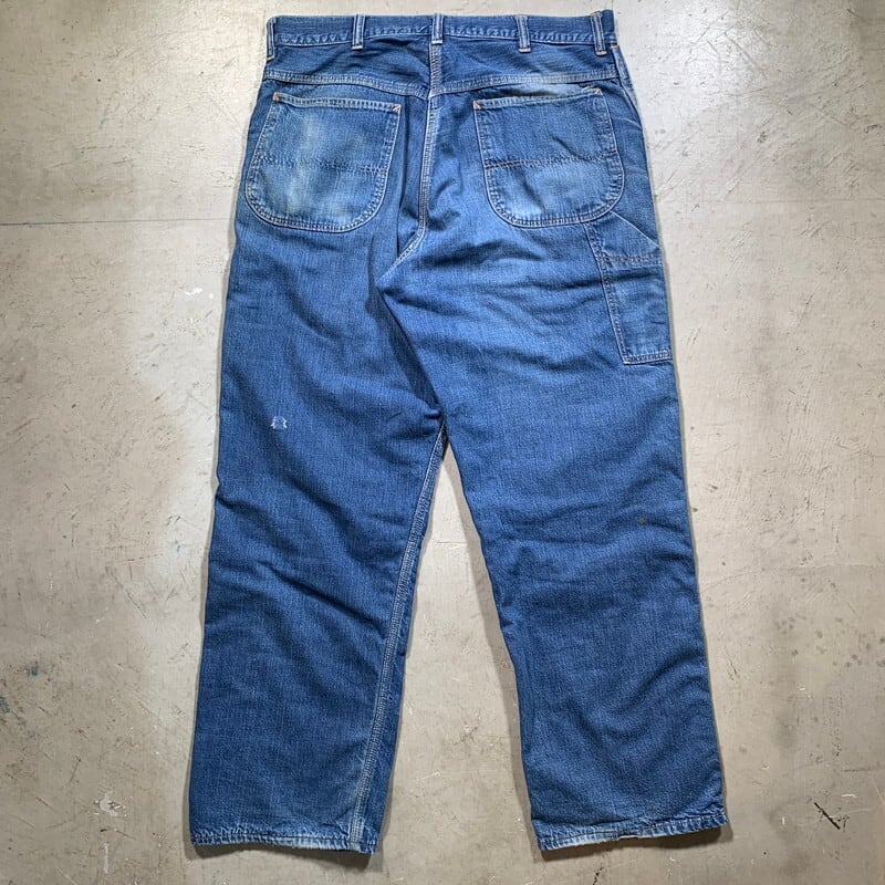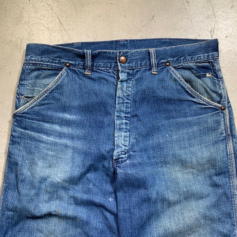 60年代頃のSearsデニムペインターパンツです。アメリカ3大ストアで知られる大手デパートメントストアのオリジナルアイテムです。こちらのペインターパンツは裏地が付くモデルで、無地のネル生地がライニングとして使われています。フロントはWALDESのカムロックジッパーが使用されています。程よく縦落ちしており雰囲気の良い個体です右ポケットにダメージ、その他内股や膝、腿裏にもダメージが見られますが、致命的なものではないので簡単なリペアで修復可能だと思います。右のバックポケット縁に簡易的なリペアが施されています。サイズ表記はありませんが実寸は約W34インチですので需要の高いアイテムだと思います。ここ数年でペインターパンツも高騰しており、サイズが良い物はなかなか見つかりづらくなっておりますので、サイズでお探しだった方は是非この機会にいかがでしょうか。