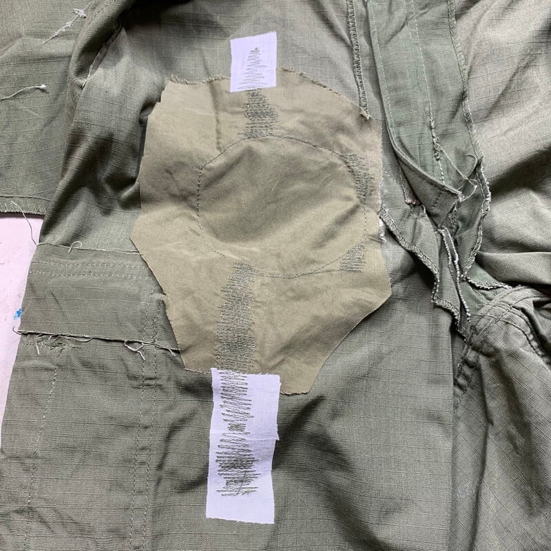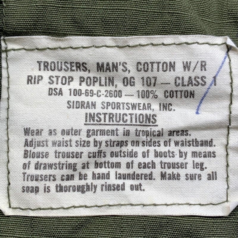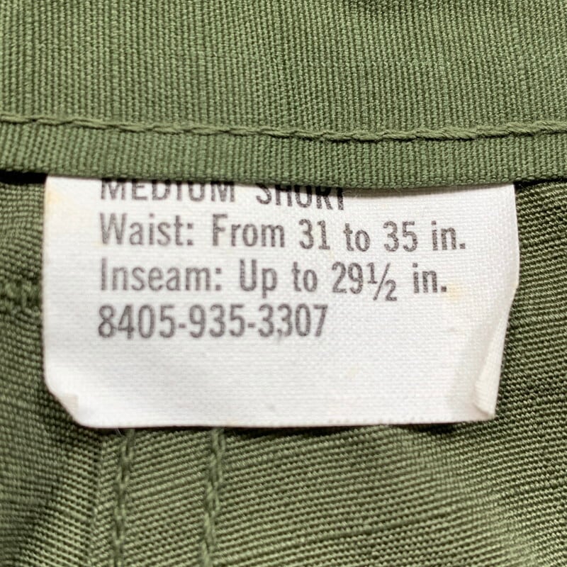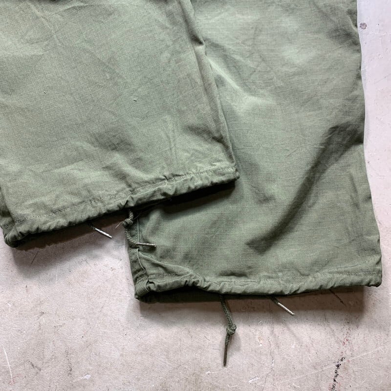 60年代のU.S.ARMYジャングルファティーグパンツです。DSA100-69-C-2600。SIDRAN SPORTSWEAR社製。フロントはSCOVILLジッパー。生地の裂け防止の為リップストップを採用した4thモデル。未使用のデッドストックで保管されていたアイテムですが、長期保管により生地にダメージが有る箇所があった為1度洗濯してリペアしています。センターの折り目付近に小さなダメージがございますが着用に問題はなさそうです。このSIDRAN SPORTSWEAR社のこのアイテムは他のコントラクターが製造したものに比べるとやや股上が浅い作りをしていますので、すっきりとしたシルエットです。サイズは MEDIUM SHORTのゴールデンサイズ。サイドのアジャスターで、5インチほど縮めることが可能です。以前にいくつかまとめて出品下時はすぐに完売してしまいましたので、前回の物より少し大きめなリペアが有りますが買いそびれた方は是非いかがでしょうか。※こちら前回出品したものと同じ時期に入荷したものですが、前回出品し忘れてました。