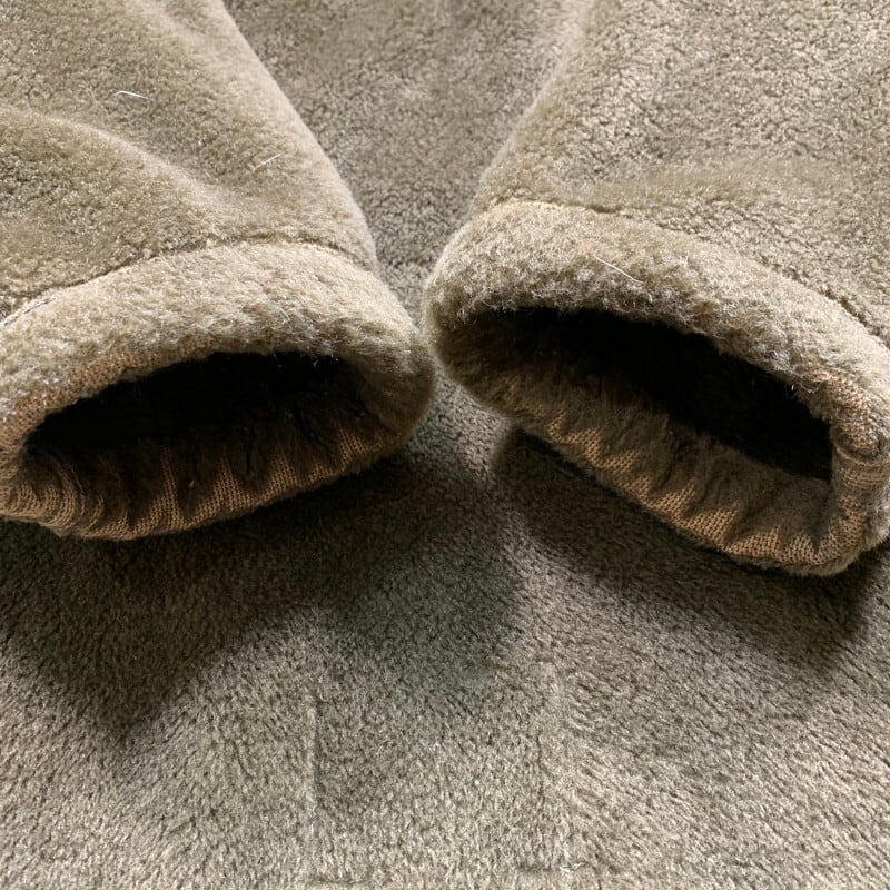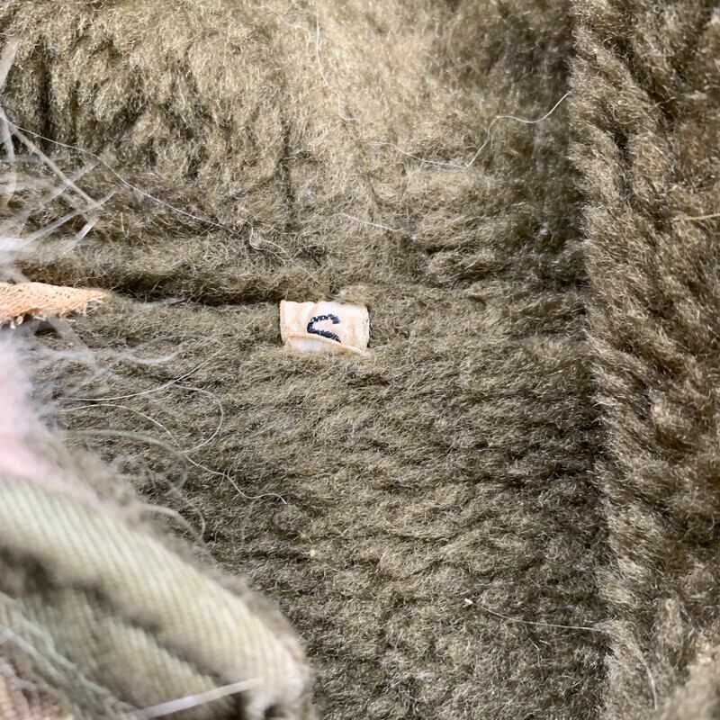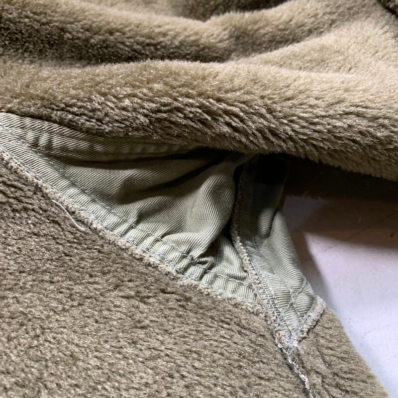 40年代頃のU.S.ARMY M-43フィールドパーカーパイルライナーです。主に山岳部隊で支給されたM-43フィールドパーカーのライニングで使用するアイテムです。ブラスのデカTALONジッパーが使用され、ボタンは濃いオリーブカラーの尿素ボタンが使われています。コヨーテファーは多少の抜けはあるものしっかりと残っています。ざっくりと被るプルオーバー型で、非常に温かい1着です。本来ミルスペックが裾の中央アタリに付属しますが、こちらは欠損しています。サイズ表記に紙タグがありますがm判読不能です。サイズはSですが中にスウェットやパーカー等を着こんでも十分なほどゆったりとした大き目な作りとなっています。袖先にパイルの抜けがやや見られます。その他ダメージや汚れは特にありません。スノーパーカーのインナーに着たり、メインのアウターとしても使えますので、お探しだった方は是非いかがでしょうか。