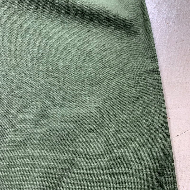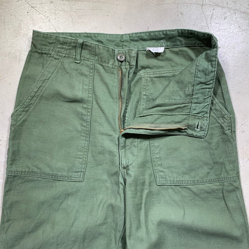 60年代のU.S.ARMYベイカーパンツです。ミルスペックはDSA100-68-C-0621、コントラクターはGLENN BERRY MFRS INC。ウエスト調整用のアジャスターボタンが付かないモデルで、フロントジッパータイプ。ジッパーは42TALONが使用されています。ボタンはオリーブです。左膝と膝裏付近に洗濯ばさみかクリップで留められていた形跡がございますが、ダメージや汚れでは無いので、洗濯である程度目立たなくなると思います。特にダメージや汚れもなく状態はグッドコンディションです。サイズは表記はW34でゴールデンサイズです。ベイカーパンツは70年代以降のモデルになるとテーパードの入ったすっきりとしたシルエットに変更されますが、それ以前のゆったりとしたストレートシルエットがお好きな方も多いと思いますので、是非お探しだった方はこの機会にいかがでしょうか。