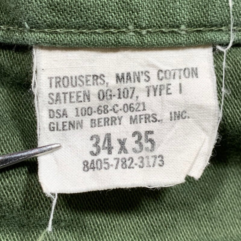 60's U.S.ARMY ベイカーパンツ OG107 コットンサテン サイドアジャスト無し DSA100-68-C-0621 GLENN BERRY MFRS INC 米軍 W34 ミリタリー 希少 ヴィンテージ BA-1778 RM2197H