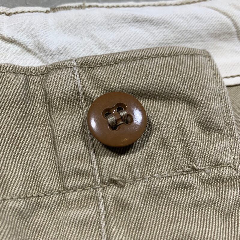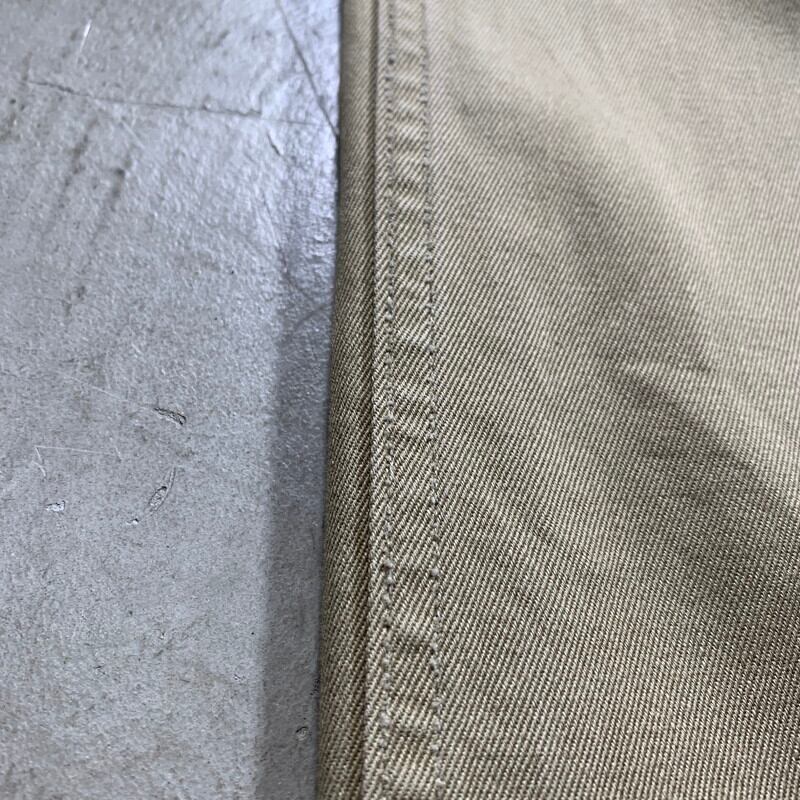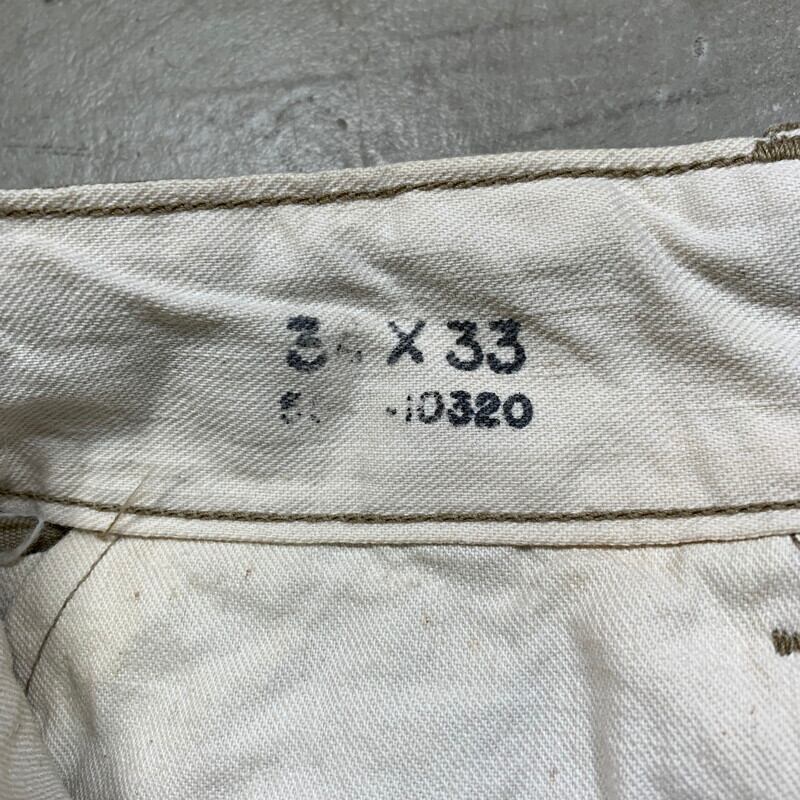 50年代初頭のU.S.ARMY 45KHAKI チノトラウザーズです。MIL-T-2064。M-1941、M1943に続き人気の高いヴィンテージチノとして知られるこちらは、フロント尿素ボタン、片玉縁のコインポケットとバックポケット、斜めのフロントポケット、アウトシームはダブルステッチです。スレーキ裏のミルスペックもしっかりと確認出来ます。ベルトループは細いタイプでオフセット仕様。バック左ポケット横に小さなハンドリペアが有り、センタープリーツ跡や擦れ、細かな汚れも見られますが、生地はしっかりとしており、大きなダメージは無くコンディションは良好です。MIL-T-2064シリーズも色々な仕様で存在しますが、中でもダブルステッチタイプを探されている方が多いように感じます。ウエスト表記はW34ですが、実寸はW32~33位。ゴールデンサイズでコンディションの良いオススメな1本です。