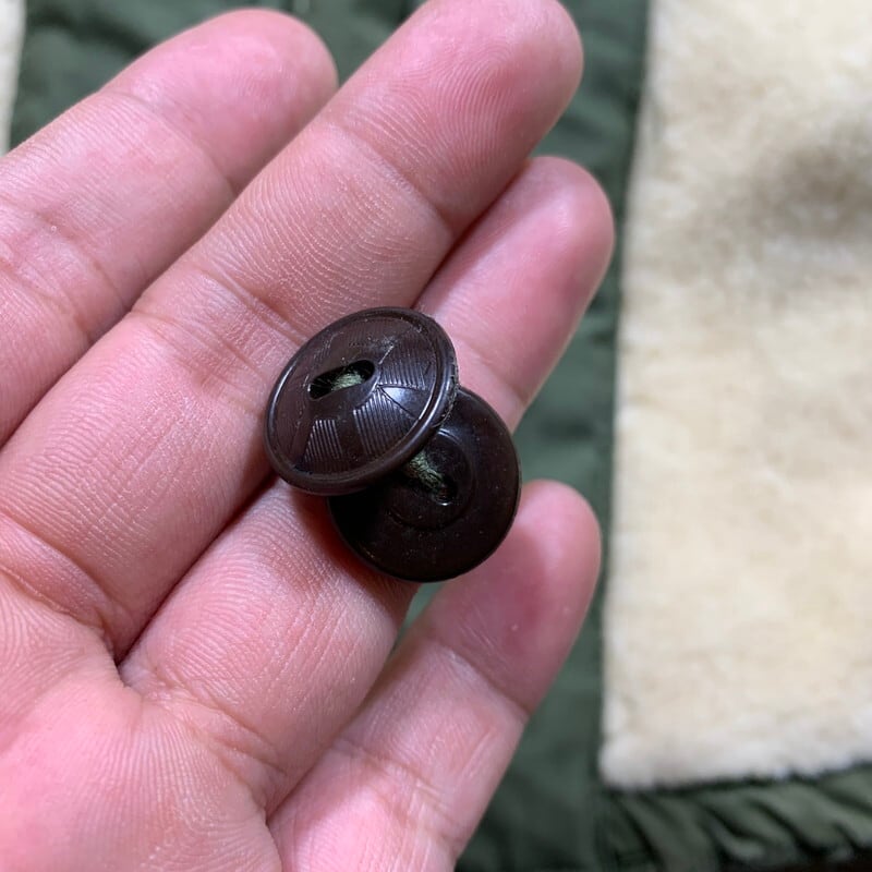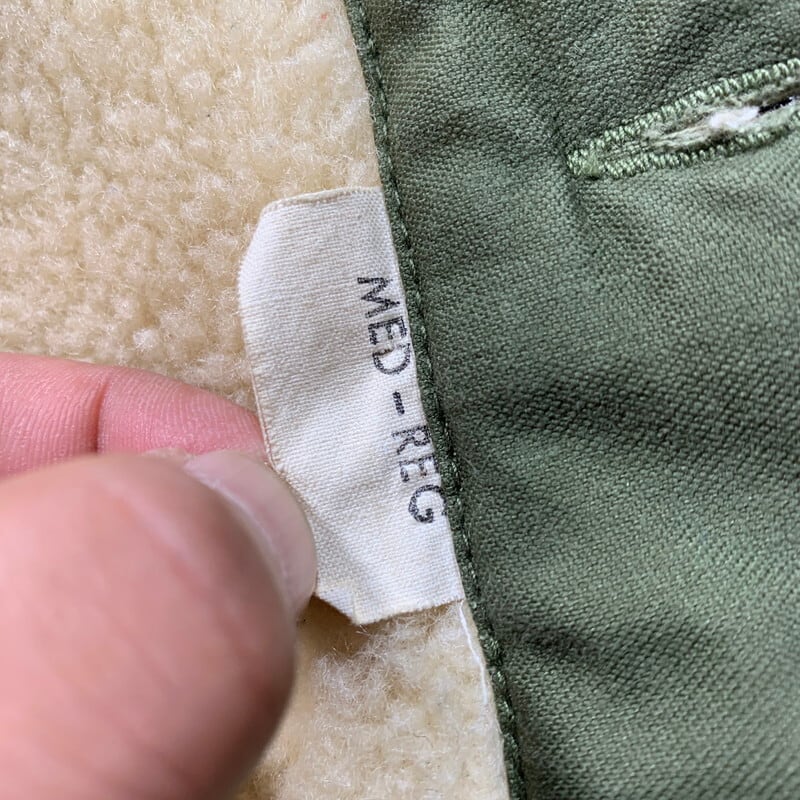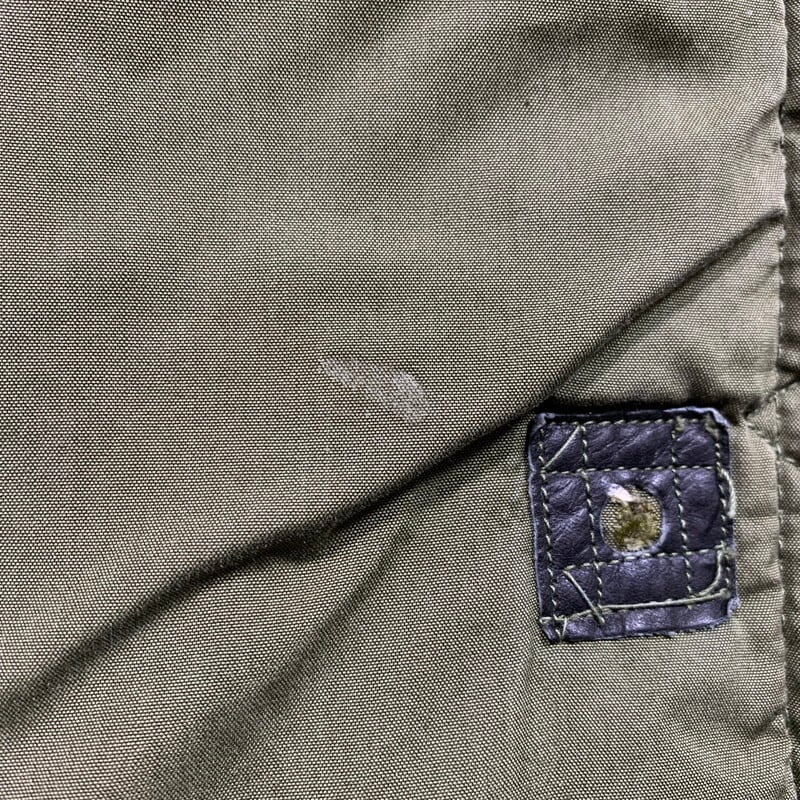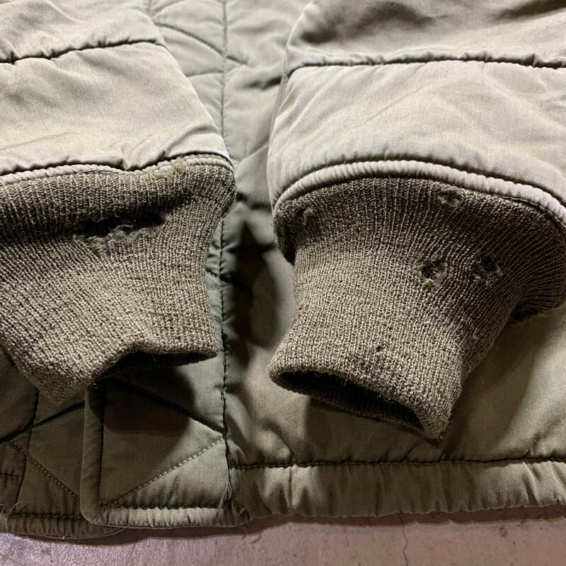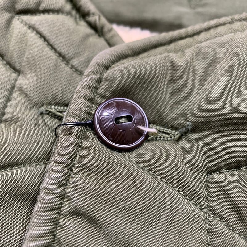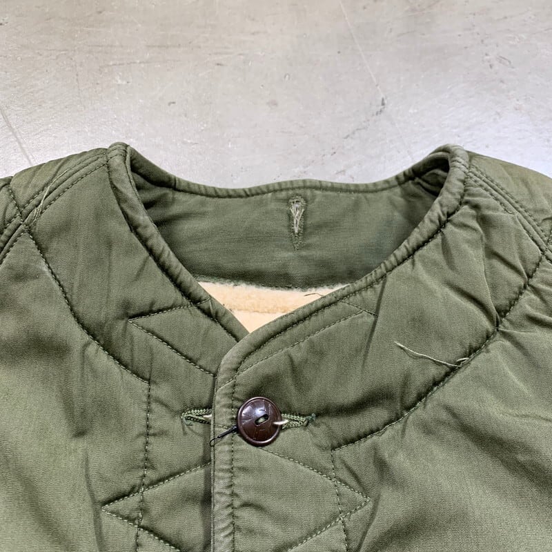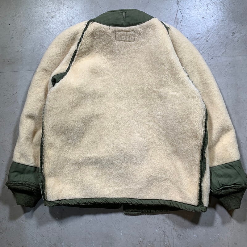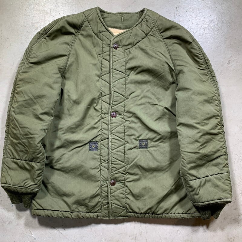 60年代のU.S.AIR FORCEキャトルジャケット用パイルライナージャケットです。MIL-L-4889C、64年採用と思われます。米空軍で採用されていたフィールドジャケット(通称キャトルジャケット)のライナーとして使用されたアイテムです。ナイロン地を内側に着用する仕様ですが、裏表どちらでも着用可能です。M-65のキルティングライナーに比べ防寒性も高いと思います。付す汚れやリブにダメージがございます。フロントには元からボタンが付かないモデルですので、男女共に着やすく、リバーシブルでも留めれる手製の拝みボタン(鼓ボタン)を取り付けています。U.S.ARMY、M-51のパイルライナーに比べ市場でも見かける事が少ないアイテムだと思いますので是非この機会にいかがでしょうか。
