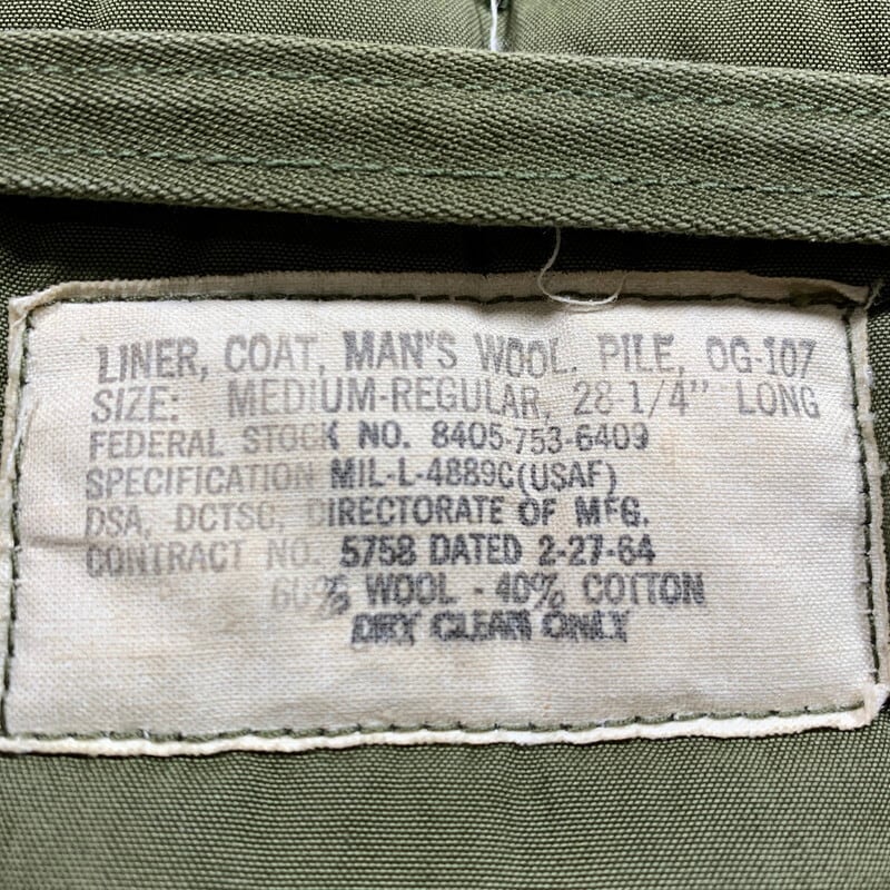 60's U.S.AIR FORCE キャトルジャケット パイルライナージャケット オリーブ 白タグ DSA,DCTSC,DIRECTORATE OF MFGMFG MIL-L-4889C USAF 1964年 空軍 MEDIUM-R 希少 ヴィンテージ BA-1580 RM1999H