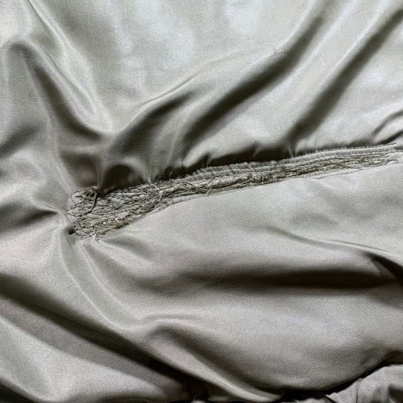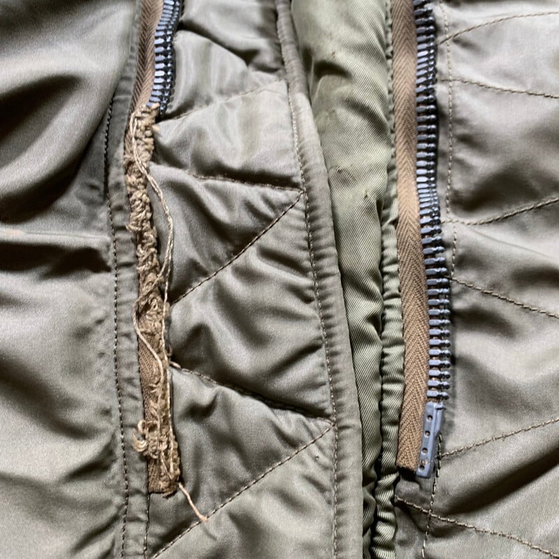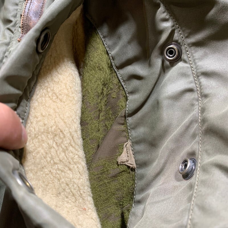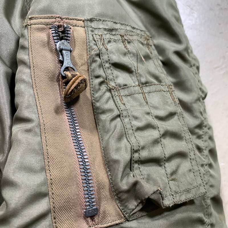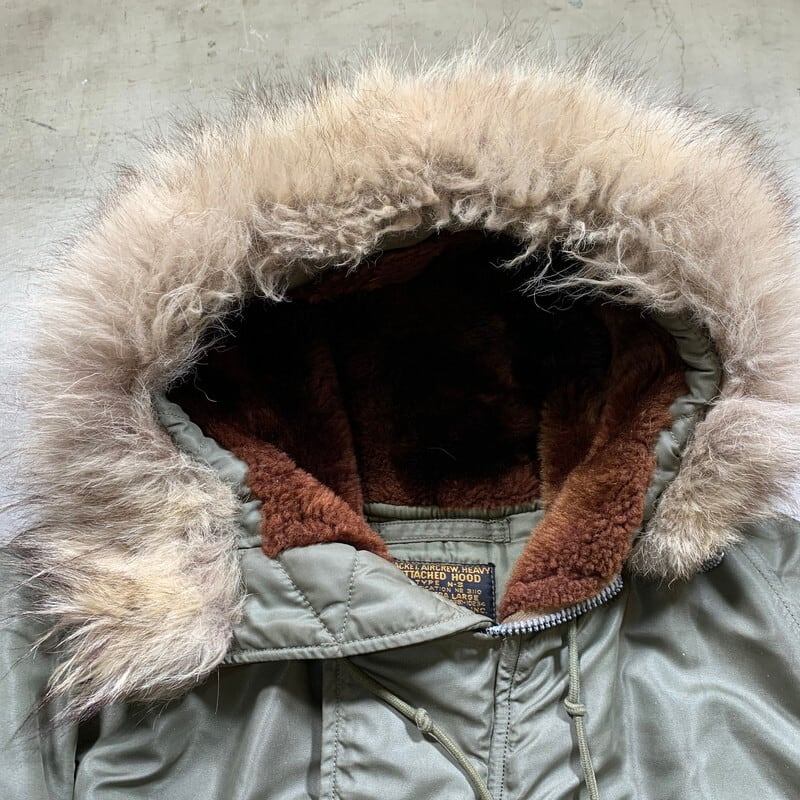 40年代から50年代初頭のUSAAF N-3フライトジャケットです。AF33(038)-10234、REED PRODUCTS社製。B-9やB-11の後継モデルであり、後のN-3Bの原型になったモデルです。N-3Bと違いリブは剥き出しで、着丈はやや短い作りをしています。オリーブドラブのナイロンシェルに、フード内側はリアルムートン、ファーはリアルコヨーテファーがあしらわれています。ジッパーはスプリング式のCROWNジッパーが使用されていますが、フロントはスライダーと歯が欠損しています。一番上のボタンのみ交換されていますが、その他はオリジナルです。左肩のUSAAFのインシグニアは確認できません。背面に3カ所リペアがございます。全体にシミや汚れもみられます。ポケット内側の生地が擦れて起毛部分が薄くなっています。リブにも若干ダメージが有ります。ジッパーは壊れているもののボタンを閉めれば問題なく着用できます。ダメージや汚れはございますが、ファーやムートンにはダメージや抜けも無く、年代を考慮すればかなりコンディションは保たれた個体です。古着市場ではN-3自体なかなか出ないスペシャルなアイテムですので、お探しでリペアも楽しめる方は是非この機会にいかがでしょうか。ジッパーを交換すればかなり良くなると思います。今後の入荷はほぼ無いといっても過言ではないスペシャルピースです。ジッパー破損と背面リペアの為かなりの破格出品です。