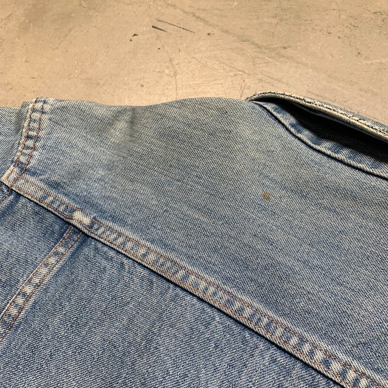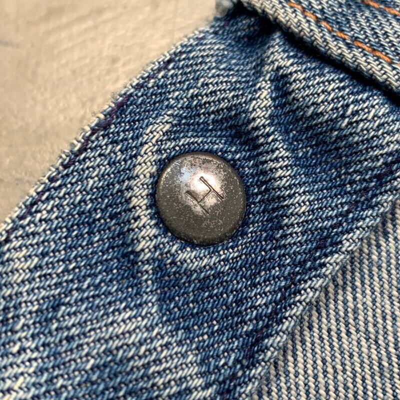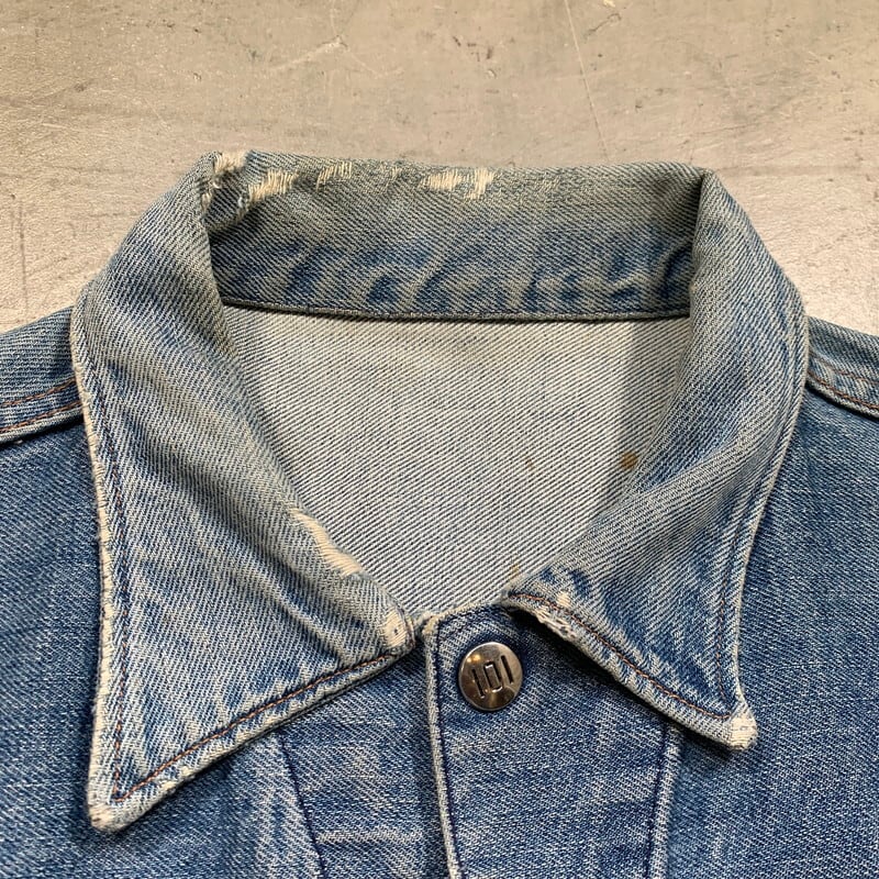 60年代頃のPOWR HOUSE101デニムジャケットです。1872年シカゴで創業したMONTGOMERY WARDが展開していたプライベートブランドです。ワークウェアラインのPOWR HOUSEから派生しウェスタンウェアを手掛けた101のアイテムで、スナップボタンもすべて101の刻印が入ります。胸元のタグは欠損しています。フロントにプリーツが入り、両胸にポケットが配置されたデザインがリーバイス社の507XXに似ている事から2ndタイプと呼ばれています。ウェスタンウェアらしいステッチがポケットに入ります。色残りは3割程度とやや色味は薄いですが、着込まれた雰囲気が良い1着です。首元や襟、袖ぐ期等に擦れによるダメージが見られます。インクやサビのような汚れもございます。サイズ表記が無い為詳細にはわかりませんが、36~38位です。サイズはやや小さめですが、着丈のあるシャツやカットソーと合わせてレイヤードを楽しんでみるのも良いかと思います。デザイン性の高い2ndタイプは合わせやすいのでお勧めです。