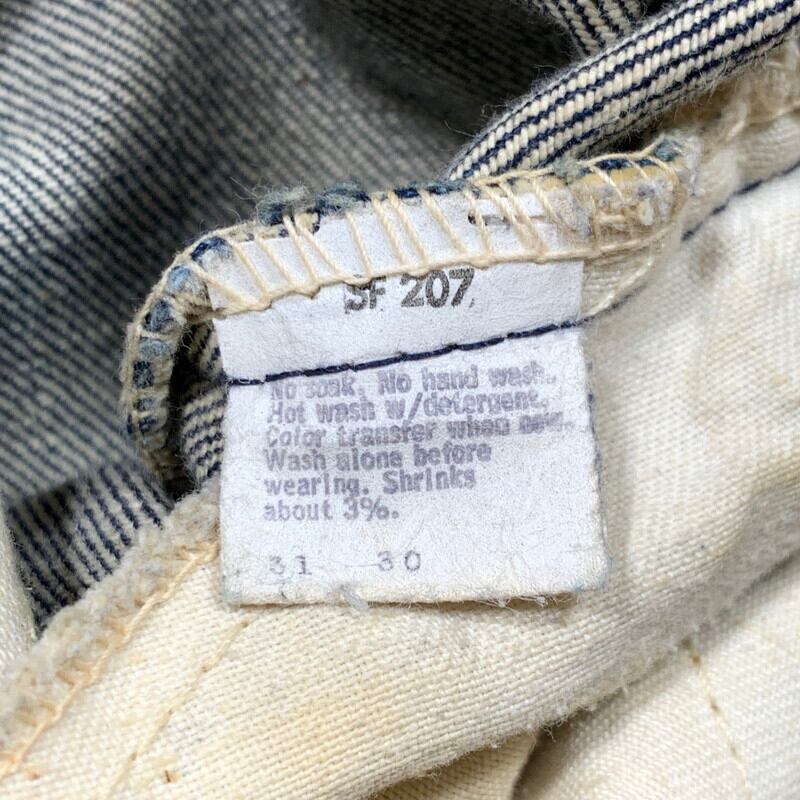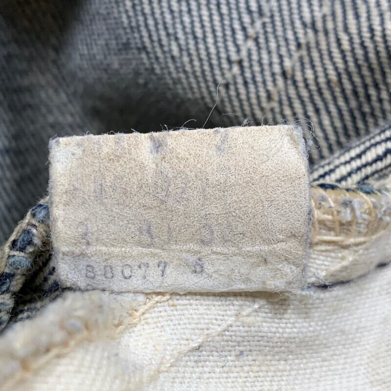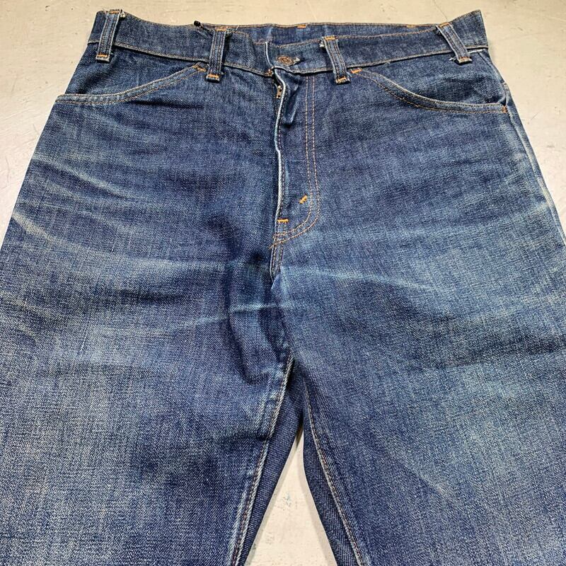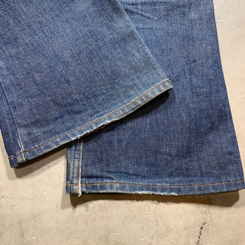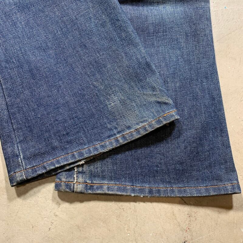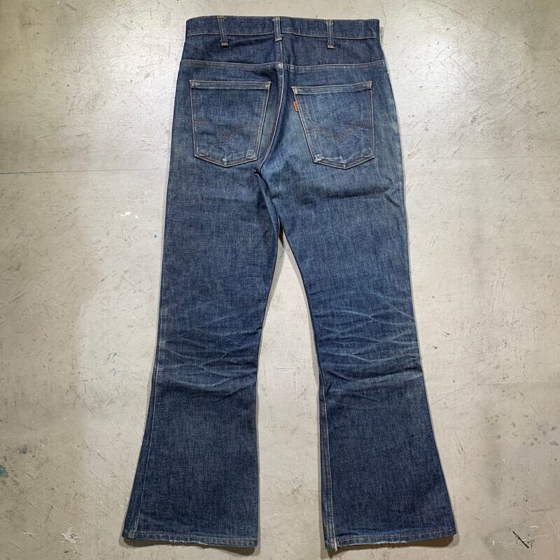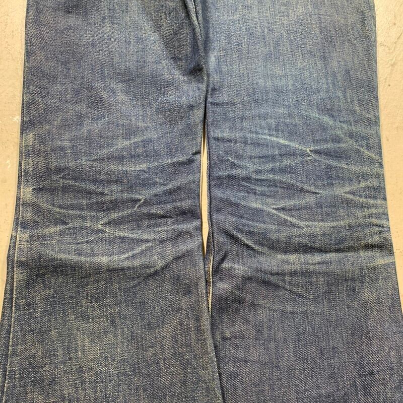 80年代初頭のLevi's 646-0217ベルボトムデニムパンツです。60年代から70年代にかけてヒッピーと呼ばれる若者たちに人気を博したことで有名なアイテムとして知られています。ボタン裏刻印563、社名ジッパー、オレンジタブ、スモールe。色残りは7~8割程度で、濃淡がはっきりしており、ヒゲやハチノスがくっきりと出た良い色落ちをしています。薄汚れ等はございますが、気にならないレベルです。バックポケットにステッチ飛びが見られ、両裾に若干擦れがございます。色味も濃いめなので、これからさらにエイジングが楽しめる1本です。シルエットがとても綺麗なのでお探しだった方は是非いかがでしょうか。