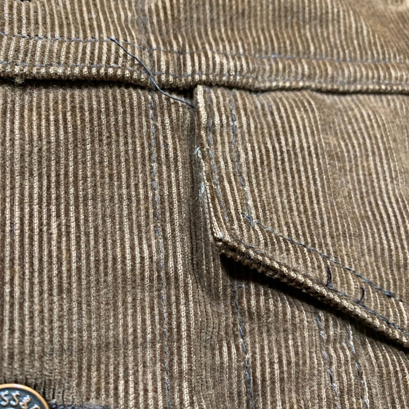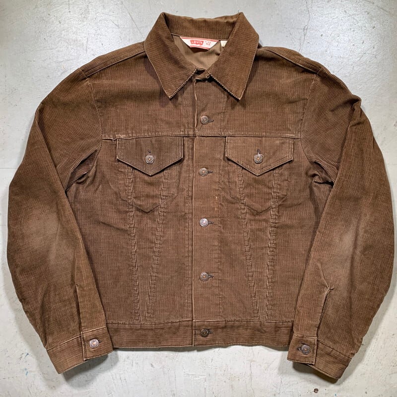 70年代頃のLevi's 70505-1529コーデュロイジャケットです。三角吊りタグ、ボタン裏は刻印52。白タブが付くモデルですが欠損しています。比較的見かける事は多いブラウンカラーですが、ダメージや汚れの少ないグッドコンディションで42表記のゴールデンサイズ物はなかなか出会わないと思います。以前はカラーバリエーションやサイズも探せば現在よりは簡単に見つける事が出来たように思いますが、ヴィンテージリーバイスの評価がグンと高くなり、今後さらに枯渇が懸念されるアイテムの一つと言えます。程よく使用感があり、経年も相まって絶妙な色合いになっています。両肘に若干色褪せが有り、肩付近もややフェードしています。身幅はしっかりとありますので、スウェット等も着込めます。サイズで探されている方は多いと思いますので是非この機会にいかがでしょうか。