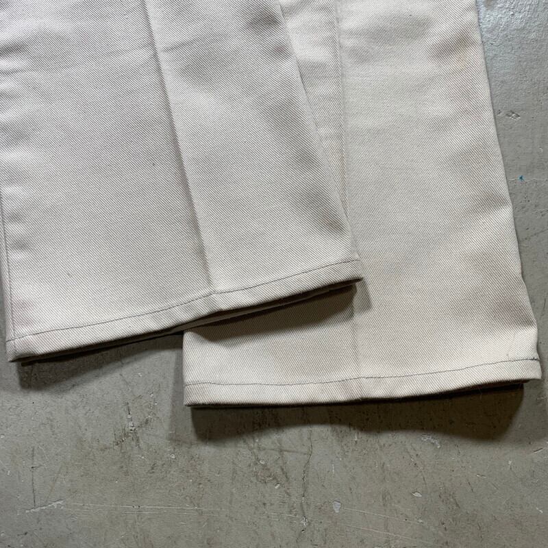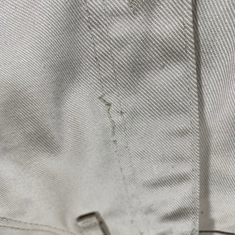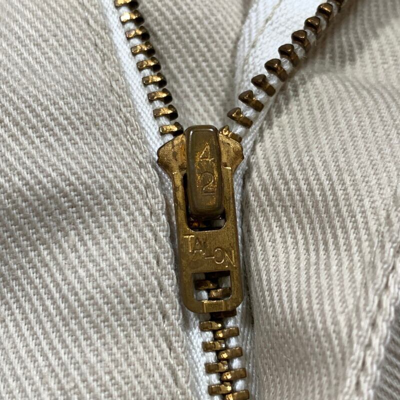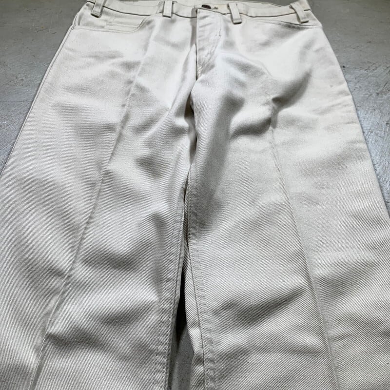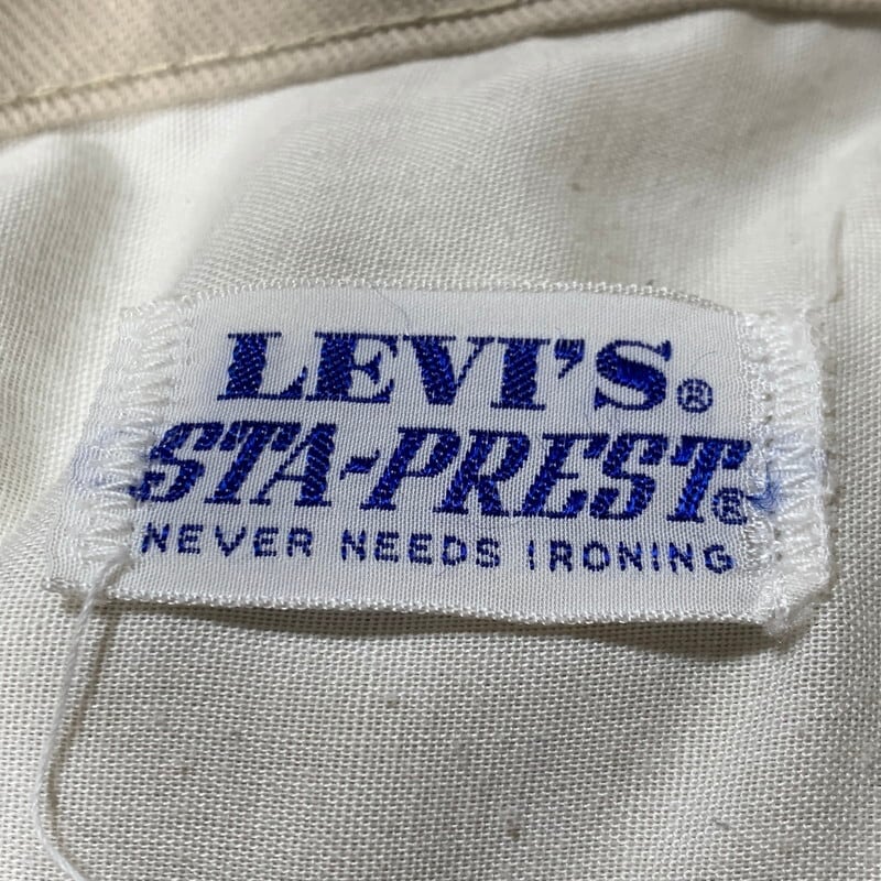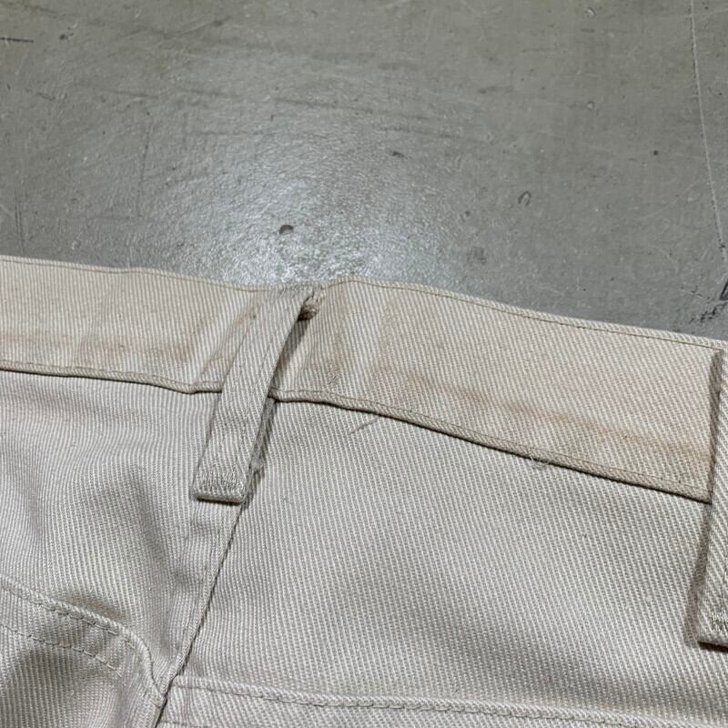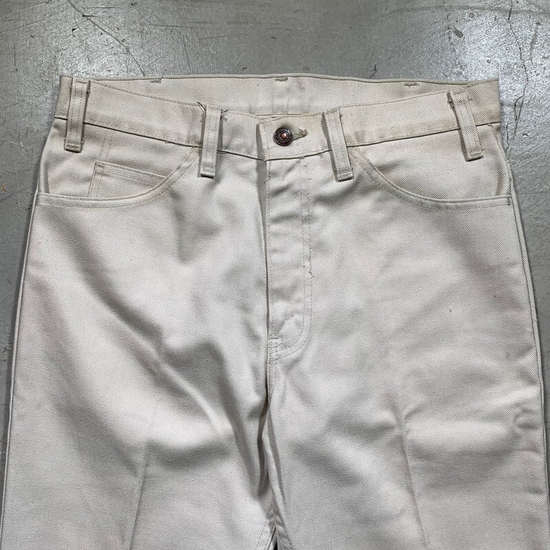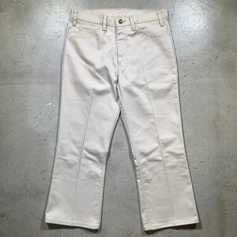 70年代のLevi's 517-1822 STA-PRESTブーツカットパンツです。コットンポリのカツラギが使用されたスタプレです。フロント42TALON、刻印520。ベージュより生成りに近いライトベージュカラーです。バックポケットにはスモールeの黒タブが付きます。ウエストにベルト擦れのような汚れが有り、その他うっすらとした小さなシミはございますが、ダメージは無く状態良好です。レングスは裾上げされています。表記W34ですが、実寸はW33位です。レングスがやや短めなので、アイビールックのようにくるぶしが見えるようなコーディネートで合わせてみてはいかがでしょうか。