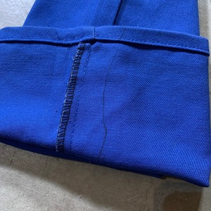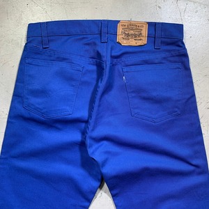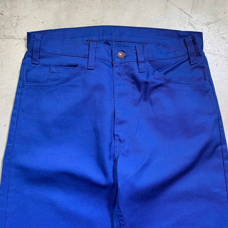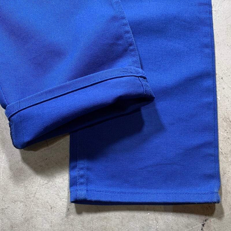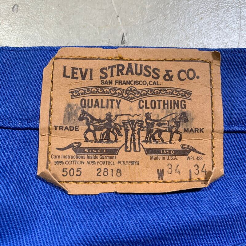 80年代頃のLevi's 505-2818カラーパンツです。コットンポリのカツラギが使用されています。色味が鮮やかで発色の良いブルーで、この手のパンツでは少し珍しいカラーだと思います。刻印520m、フロントジッパーは社名刻印。バックポケットの白タブはカットされています。紙パッチにIRREGULARスタンプが押印されており、右足アウトシーム内側に生地を裁断する際につけたのかガイドラインのような線が膝から裾までくねくねとペンで書かれています。うっすらとした汚れや若干の擦れはございますが、使用感自体は少なくグッドコンディションです。レングスはシングルですが、恐らくオリジナルで、長さも十分です。サイズは表記通りW34インチ。鮮やかで綺麗なブルーですので、ユーロ物のワークやミリタリーアイテムとも相性が良いと思います。