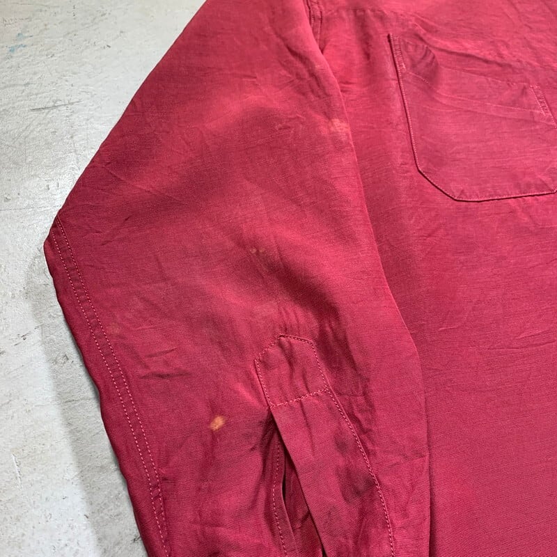 40年代から50年代頃のPilgrimレーヨンプルオーバーシャツです。アメリカ3大ストアのSearsが1906年から1964年頃まで展開していたプライベートブランドです。こちらはハーフジップのプルオーバータイプで、胸元にステッチによる切り替えが特徴的な1着です。胸ポケットもステッチに沿ったカッティングとなっており、デザインの凝ったディティールです。ジッパーはコーティングされたTALONのピンロック式が採用されています。襟の形状も広く長いロングポイントの形状で、タグは当時のアロハシャツに縫い付けられていた物と同じタイプです。レジスターマークでは無くREG表記で、40年代後半頃の物でないかと思われます。ダメージは特にございませんが襟や袖、裾付近に変色や色抜けが見られます。サイズ表記は下部が少し擦れてはっきりとはしていませんがLサイズで間違いありません。身幅もしっかりとありますので、程よくゆったりと着用していただけると思います。なかなか変わり種なデザインですが、装飾等無くシンプルなので、様々なコーディネートに合わせていただけます。この年代あたりの大き目なサイズはなかなか見つからず希少ですので、サイズが合う方は是非いかがでしょうか。