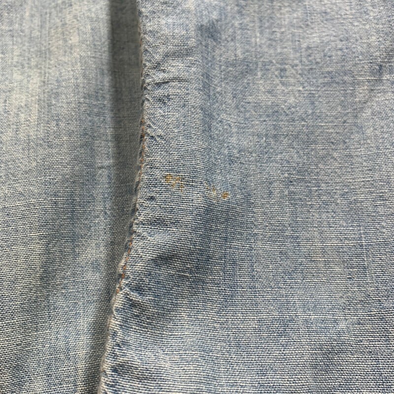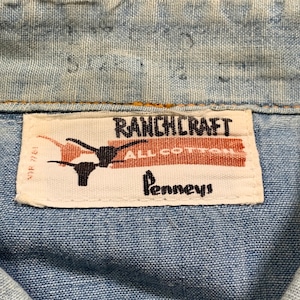 60年代頃のRANCHCRAFTデニムウェスタンシャツです。アメリカの3大ストアのJC Penneyが手掛けるウェスタンウェアブランドです。薄手のデニム地で、首元にはプリントタグが付きます。トップボタンは縫いつけ、その他はスナップボタンです。裾がカットオフされていますが、元のステッチに沿ってカットされている為シルエットは自然です。フロント前立てに一部ステッチ飛びがあり、うっすらとした汚れが襟元や袖等に見られます。両肩は若干ヤケが入ります。サイズは15 1/2表記ですが、裾のカットオフで着丈はやや短めとなります。ジャスト目で着用したい方には良いサイズ感だと思います。着丈が短くなっているので、女性も着やすくなっています。ストア系のデニムウェスタンシャツは様々有りますが、意外とこのRANCHCRAFTのウェスタンシャツは見かけないと思われます。サイズが合う方は是非いかがでしょうか。