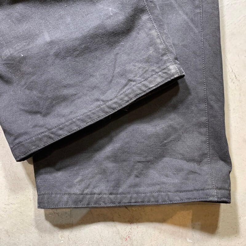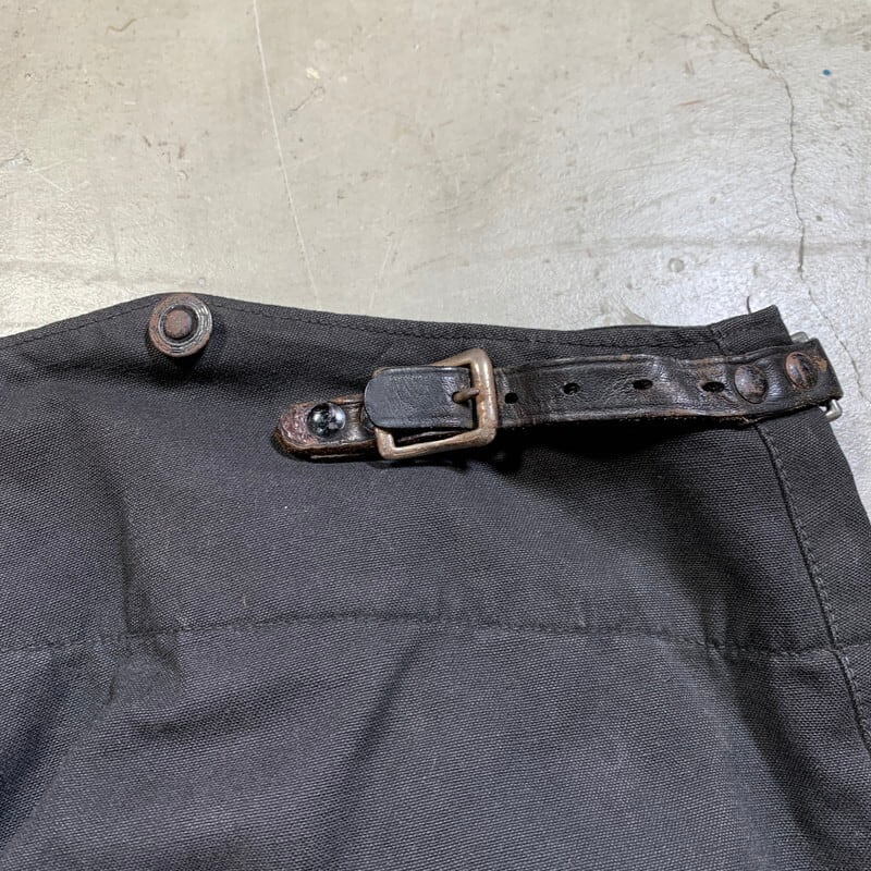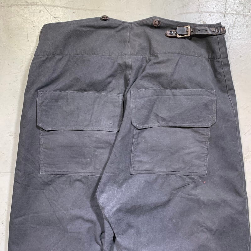40年代頃のC.H.PETCHファイヤーマンパンツです。C.H.PETCHはカナダのオタワで人や物を雨や日差しから守る粗布製の天蓋等を製造していたメーカーです。バックポケット内に当時のメモが見つかり、そこに記されたNATIONAL FIRE SERVICEは第二次世界大戦時の1941年にイギリスで創設された消防署の団体です。しっかりとしたダック生地にネルの様なライニングが付く仕様です。ウエストには打ち込みのサスペンダーボタンと、レザーのアジャスター、フックが付きます。ウエストのボタンが2カ所手縫いに取り換えられています。使用感や裾に若干のダメージは見られますが、ライニングも綺麗に残っており、年代や使用用途を考慮するとかなり状態は良いと思われます。ポケット内から見つかったメモはサインのような文字しか書かれていませんが、歴史的資料価値としても申し分ないと思います。ウエストは実寸でW33インチ位です。ファイヤーマンパンツとしては穿きやすいサイズです。ブラックカラーが程よく褪色し墨黒のような色合いに変化しており、雰囲気の良いお品です。お探しだった方は是非この機会にいかがでしょうか。これからの寒くなる季節にバイクに乗られる方にもお勧めしたいアイテムです。