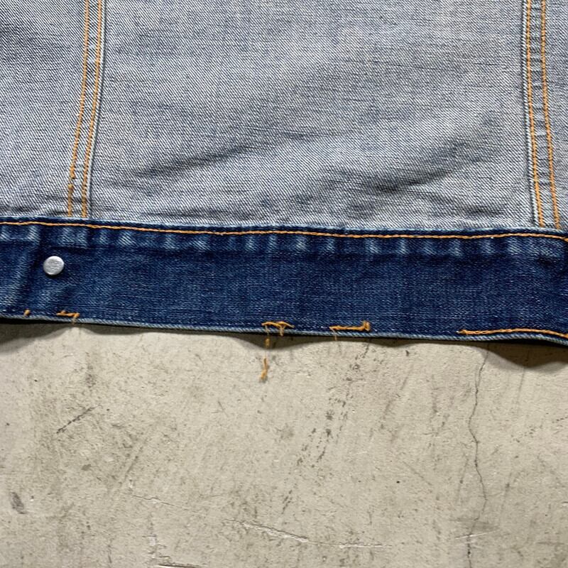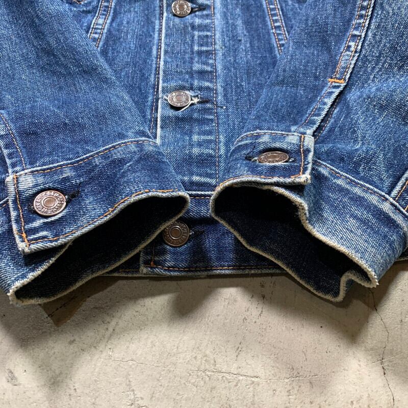 60年代のLEVI'S 70505デニムトラッカージャケットです。小紙パッチ、ボタン裏525刻印、不均等V、Big E、ポケット裏シングル、閂ブラック。白いケアタグが付く以前のモデルです。所謂4thと呼ばれるリーバイスのデニムジャケットの集大成といえる完成されたデザインが人気の1着です。557の3rdに比べ着丈も長いのでファッション性も高く様々なスタイリングに使える優れものです。色残りは6~7割ほどで着込めばさらに濃淡のついたエイジングが楽しめそうです。襟に若干ダメージ、袖先に擦れが見られます。両袖にはハチノスが入ります。下から2番目と3番目のボタンホールが若干緩くなっています。ステッチ飛びもいくつか見られます。パッチの表記が薄れていますが、サイズ36位。女性も着やすいサイズです。少し小さめサイズですのでお買い求めしやすい価格となっております。是非この機会にいかがでしょうか。