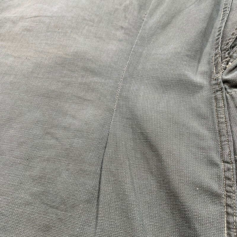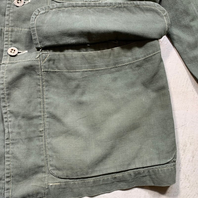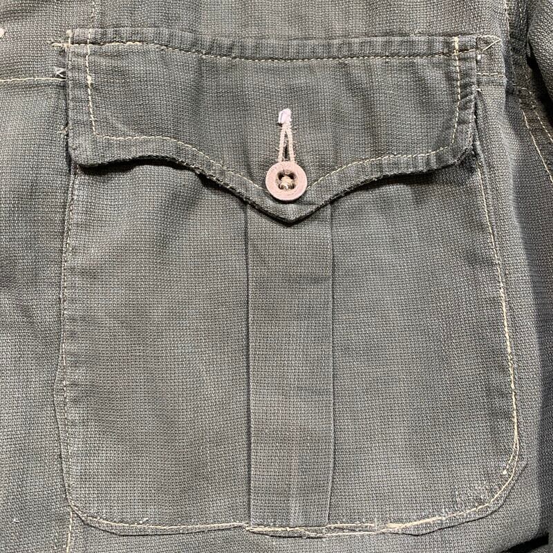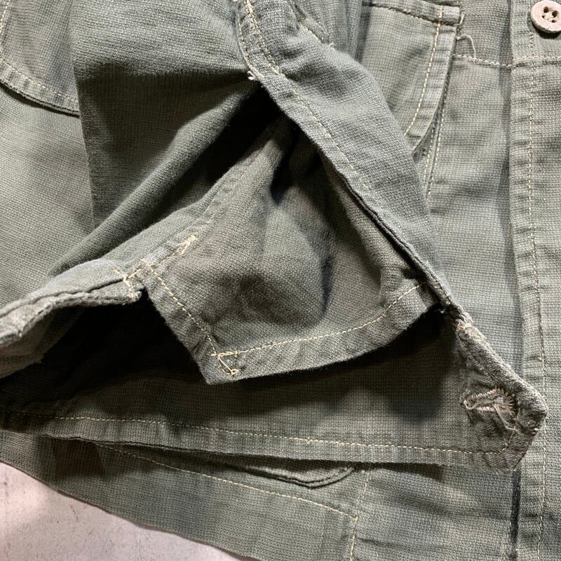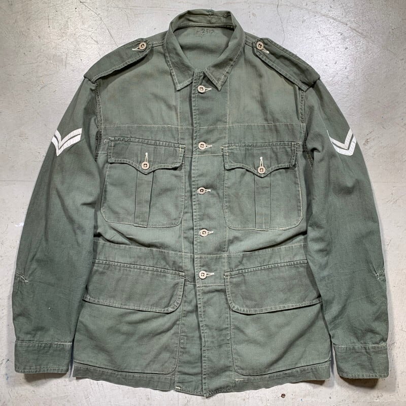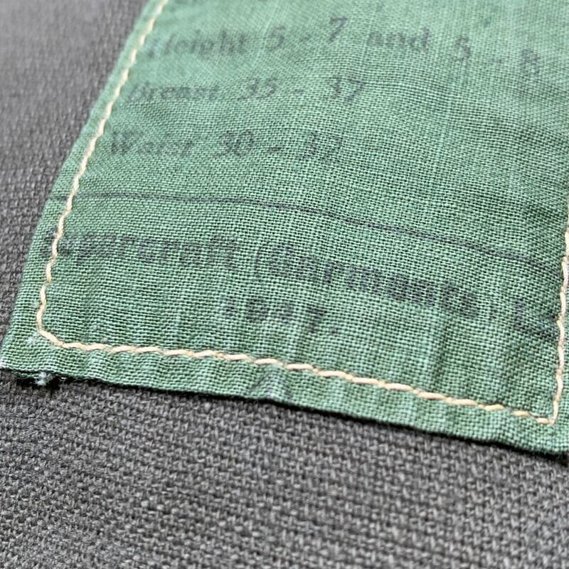 40年代のBritish Army ブッシュジャケットです。正式名称はJACKET BUSH S.C.C.19 GREEN。Supercraft社製で1947年コントラクト。イギリス軍のブッシュジャケットの中でも非常に希少な40年代のアイテムで、50年代の物はトップボタンの付かない開襟仕様で、ベルが付くアイテムですが、こちらはトップボタンが付き、ウエストのベルトは元から付かないタイプです。ミルスペックにあるようにS.C.C.19GREENと記載が入るモデルで、絶妙な色合いが特徴的です。カフスには独特な形状のマチが付き、ボタンも古い仕様となっております。背面にはウエストにタックが入りますのでシルエットも非常に綺麗です。サイドベンツ仕立てなので、裾のもたつきも解消されすっきりとして見えます。襟元にハンドリペアで穴を塞いだ箇所がございます。多少の擦れや経年による褪色等はございますが、襟のハンドリペア以外は非常にコンディションが良い個体です。イギリス軍の中でもなかなか市場では見かける事のない珍しいアイテムですので、お探しだった方は是非この機会にコレクションされてみてはいかがでしょうか。サイズ表記は7で、体感では38位です。ウエストが少しシェイプされているので、野暮ったく無くすっきりとした印象です。