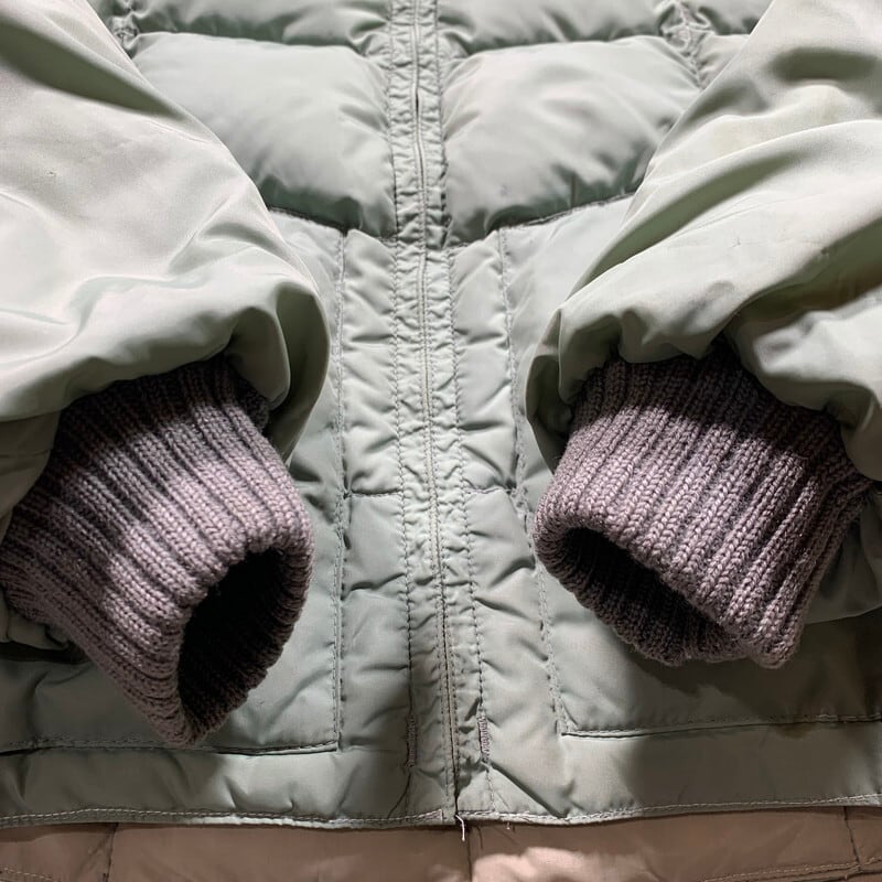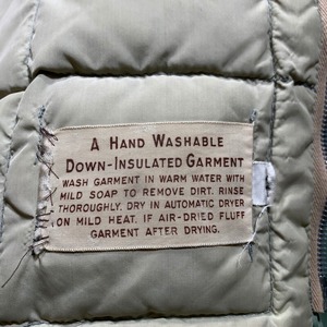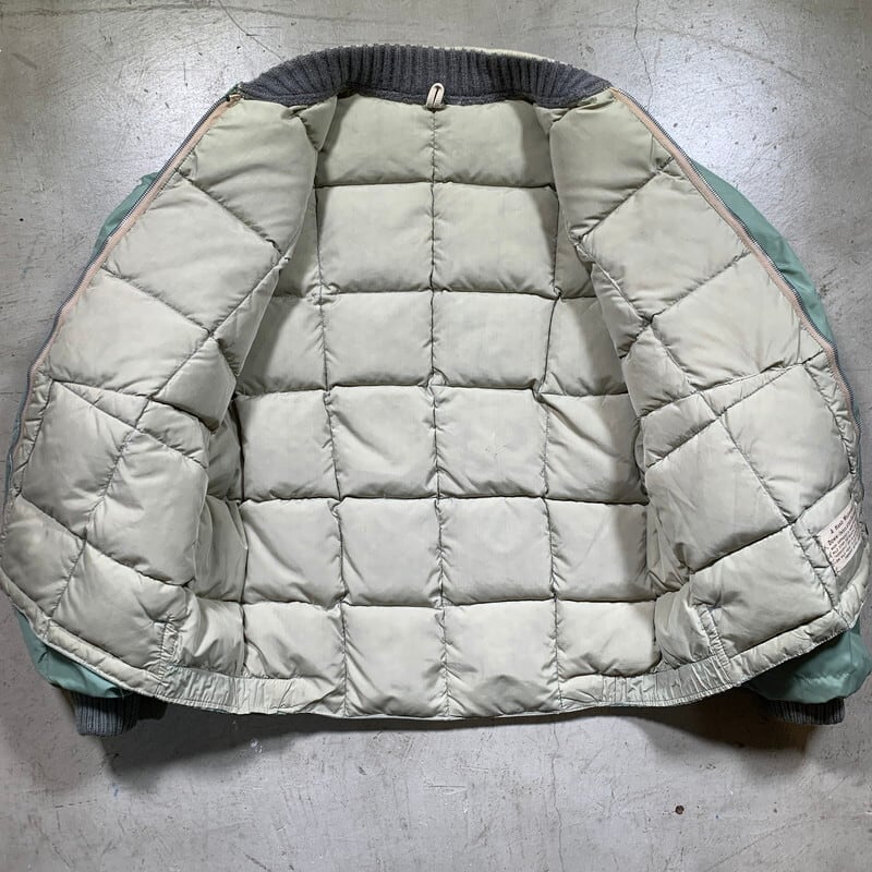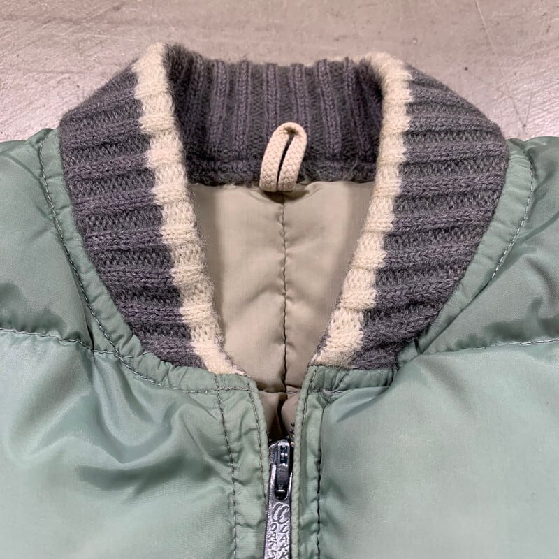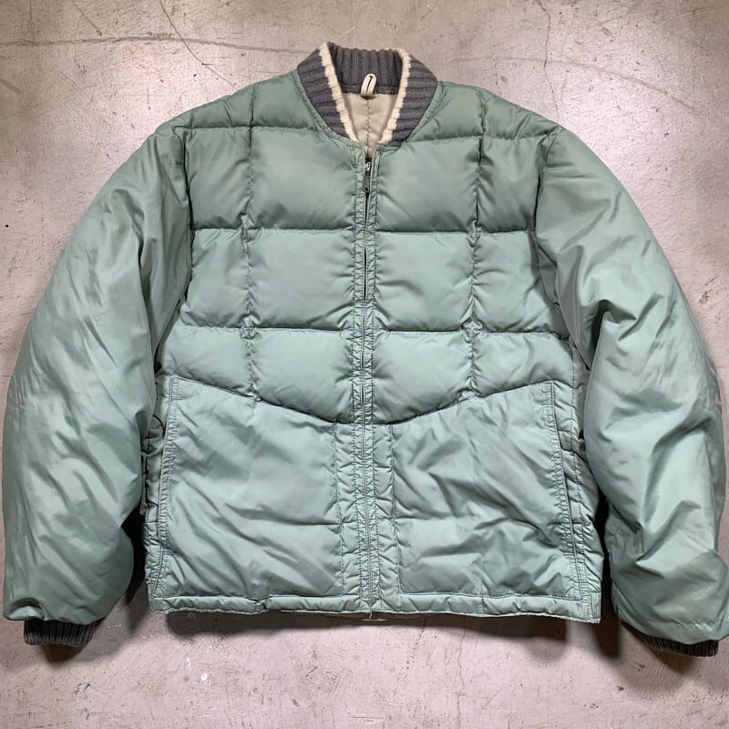 60年代頃のCONFYキルティングダウンジャケットです。タグが欠損しておりますが、デザインやディティールからブランドはCOMFYと思われます。1915年シアトルで誕生したブランドです。淡いセージグリーンのボディにはCOATS&CLARK社のジッパーが使用されています。エディーバウアーのスカイライナーのようにウエストの絞りは無くボックス型で着やすいシルエットです。左ポケットと、左胸付近にステッチの縫い直しが見られますが、とても丁寧に直されています。内タグはハンドステッチで片側が縫い直されています。右のハンドウォーマーポケットと右サイドの下部にステッチ飛びが見らえます。薄汚れもございますが、ダウン抜けも殆ど無く状態は良好です。表記はMサイズです。着丈はやや短めですっきりとしています。ヴィンテージスウェットの上から羽織るにはちょうど良い丈感だとおもいます。手頃な価格帯のダウンジャケットですので、これからの季節に是非いかがでしょうか。