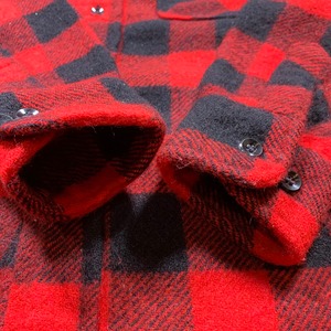 50年代から60年代頃のTOWNCRAFTウールバッファローチェックシャツです。TOWNCRAFTとはアメリカ3大ストアと呼ばれるJCPenneyが展開していたプライベートブランドです。ハンティングウェアで使用される肉厚なウール地が使用されておりライニングは付かない1着です。サイド裾にはマチが付きます。ボタンは全てオリジナルで揃っています。左のマチ付け根に破れがございますが、簡単なリペアでカバーできると思います。その他ウール特有の毛羽立ちは見られますが、目立つ汚れやダメージは特にございません。サイズ表記はMですが、少しゆとりがあるのでL相当だと思います。赤黒のバッファローチェックはネルシャツの定番柄ですので、1枚あると差し色にも使えますのでお勧めです。アウトドアブランド物では無くストアブランド物というのもポイントかなと思います。
