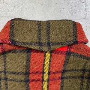 50年代から60年代頃のWoolrichプルオーバーチェックシャツです。ウールリッチは1830年に創業し、ウール製品からアウトドア、ハンティングウェア等を手掛ける現存する老舗ブランドです。三角の織タグが付くこちらは、プルオーバータイプで、ふろんとには ループボタンが2個付きます。裾の形状が特徴的で、センターに向かって山なりになったデザインです。袖は筒型のボタンが付かない仕様です。ボタンは2つ共交換されています。ウール特有の毛羽立ちがあり、右袖に小さな生地の解れが見られますが、その他は気になる汚れやダメージも少なく状態は良好です。XL表記で、身幅は広めですが着丈はそこまで長く無いのでとても着やすいサイズ感です。ハンティングウェアに寄せたコーディネートも良いですし、都会的にスリムなパンツを合わせて綺麗目なコーディネートでも使い易いと思います。