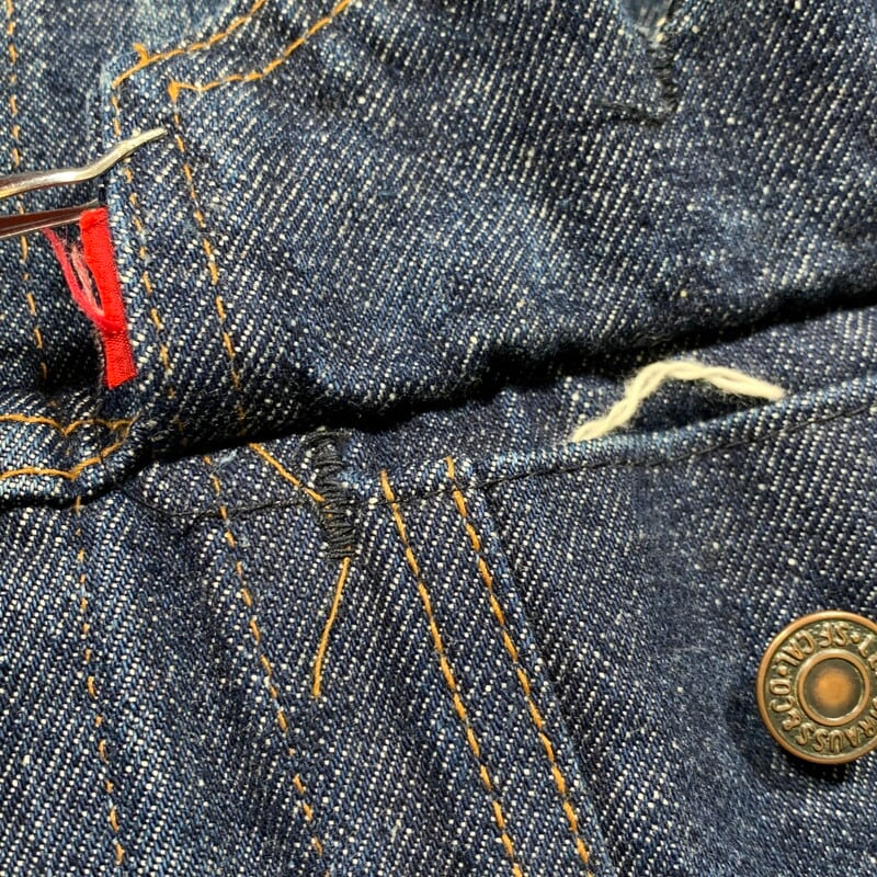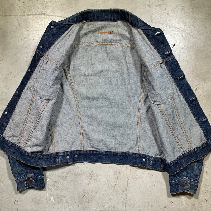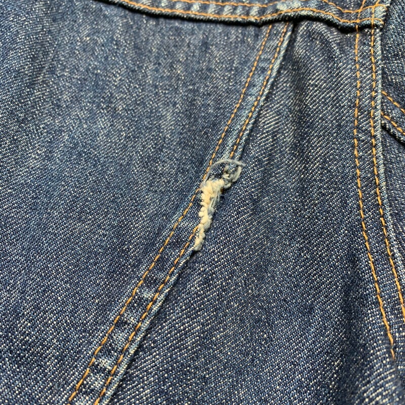 70年代のLevi's70505-0217デニムジャケットです。4thと呼ばれ、70年代初頭にBig Eからsmall eへと変更になった直後あたりのモデルです。紙小パッチ、赤タブスモールe、ブラック閂、刻印52。水に通った回数も少ない濃紺カラーで、パッチの大半は欠損していますがsize42と確認できるグッドサイズ。赤タブの刺繍がほつれていますが、スモールeで間違いありません。襟元に色落ちが見られ袖口に若干の擦れがございます。背中のステッチに1カ所ダメージがありますが簡単なリペアで目立たなくなると思います。8割以上色味も残っていますので、がっつり育てる事もお楽しみいただけます。ここ数年で70505の人気も高くなり、以前に比べ少し手に入れづらくなっております。特に40以上のサイズがある物は探している方も多いので、サイズが合う方は是非お早めに。サイズ状態共にオススメです。