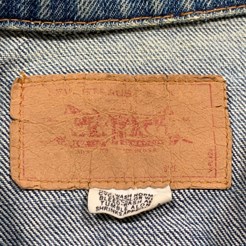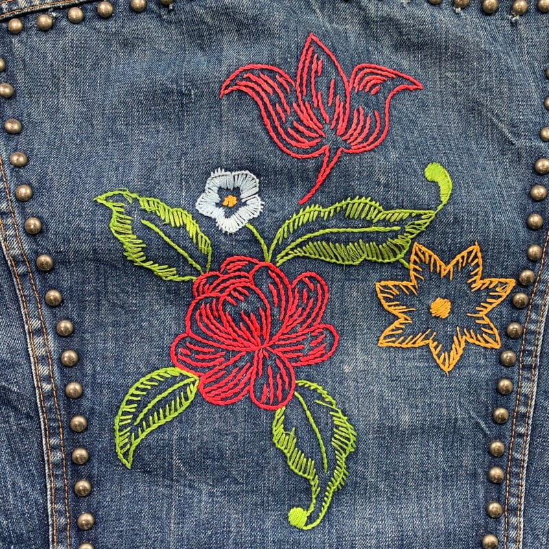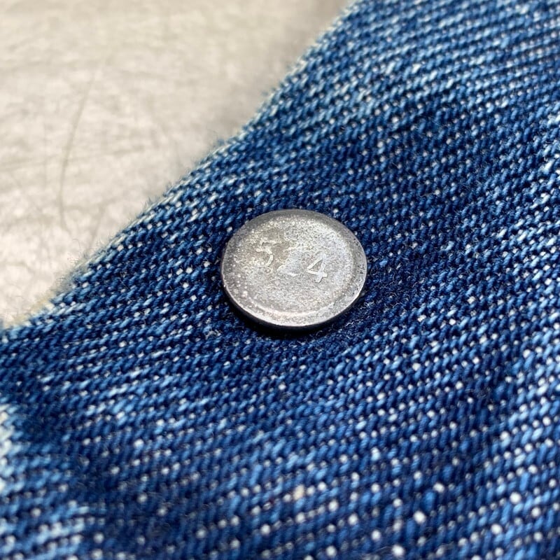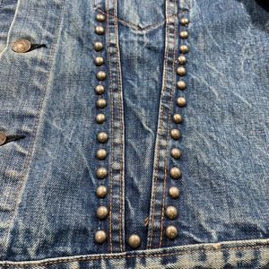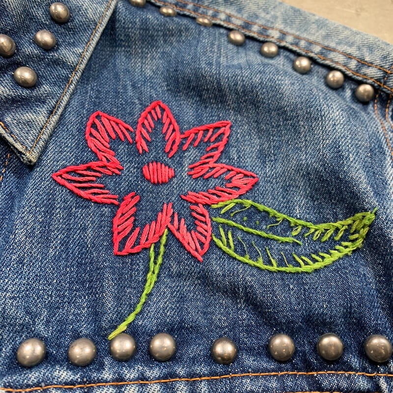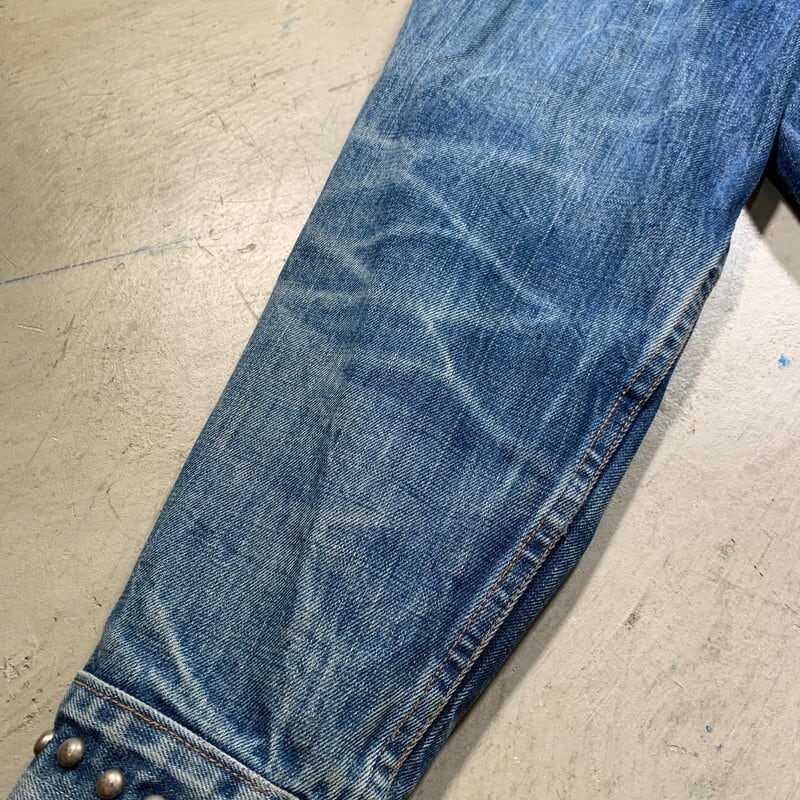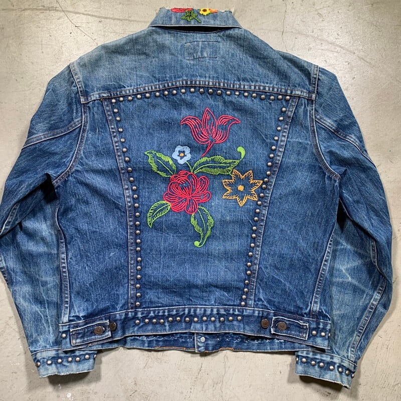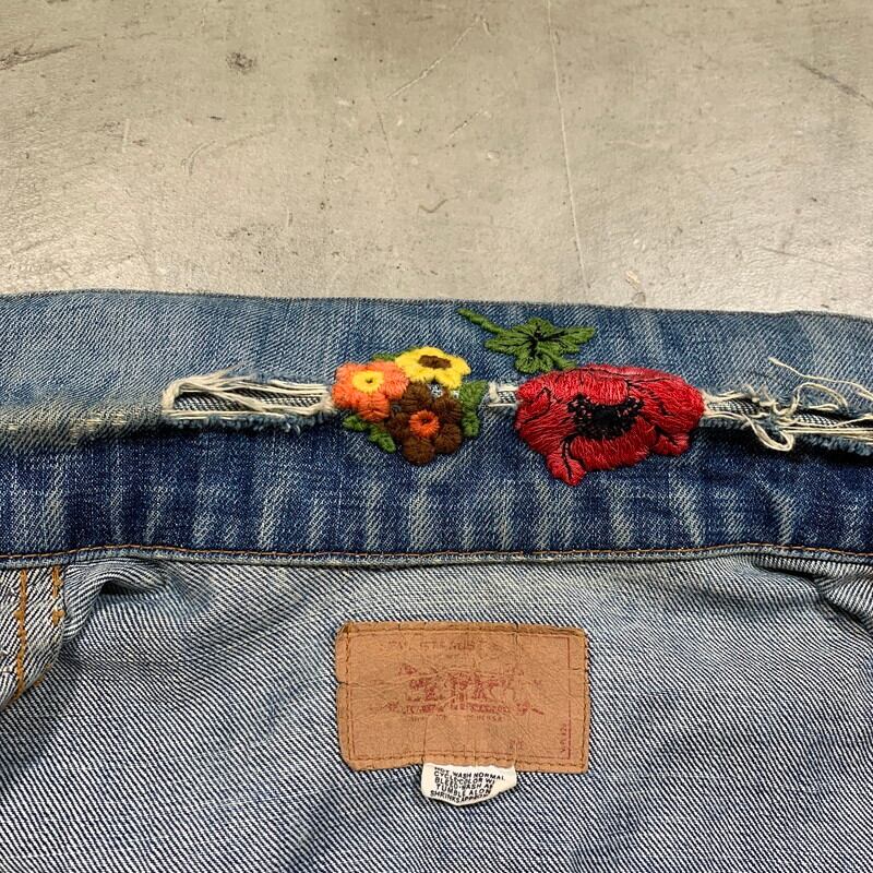 70年代のLevi's70505-0217デニムジャケットです。4thと呼ばれ、70年代初頭にBig Eからsmall eへと変更になった直後あたりのモデルです。紙小パッチ、赤タブスモールe、ブラック閂、刻印524、ケアタグ付き。胸元、襟、背面にハンドステッチの刺繍やスタッズでカスタムされたヒッピーテイストあふれる1着です。全体的に程よく色落ちしており、袖にはしかりとハチノスも入ります。襟元にはダメージがございますが、その上から刺繍のアップリケが手縫いで取り付けられています。カラーバランスも良くスタッズも丁寧に打ち込まれており、裏側の爪の処理もしっかりとされているのでインナーのお洋服に引っかけたりする心配もなさそうです。先述の通り襟元のダメージ以外に袖口や裾にも擦れによる若干のダメージがございます。紙パッチは残っていますが、印字が消えています。サイズは一つ前の70505とほぼ同じ位なので、恐らく42位だと思います。サイズも大き目で唯一無二なカスタム物はなかなか出会わないと思います。少しスパイスの利いたデザインがお好きな方は是非いかがでしょうか。